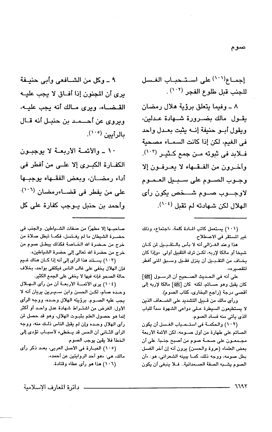 (¬102) والحكمة فى استحباب الغسل أن يكون الصائم على طهارة من أول صومه، لكن الأئمة الأربعة مجمعون على صحة صوم من أصبح جنبا. على أن بعض العلماء (عروة والحسن) يرون أنه إن أخر الغسل بطل صومه، ووجه ذلك، كما يبينه الشعرانى، هو: "أن الصوم يشبه الصفة الصمدانية. . فلا ينبغى أن يكون صاحبها إلا مطهرًا من صفات الشياطين. والجنب فى حضرة الشيطان ما لم يغتسل، فكما تبطل صلاة من خرج من حضرة اللَّه الخاصة فكذلك يبطل صوم من خرج من حضرة اللَّه تعالى إلى حضرة الشياطين.