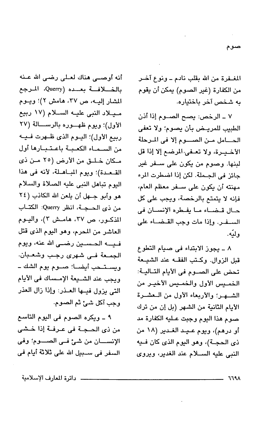 7 - الرخص: يصح الصوم إذا أذن الطبيب للمريض بأن يصوم؛ ولا تعفى الحامل من الصوم إلا فى المرحلة الأخيرة، ولا تعفى المرضع إلا إذا قل لبنها. وصوم من يكون على سفر غير جائز فى الجملة. لكن إذا اضطرت المرء مهنته أن يكون على سفر معظم العام، فإنه لا يتمتع بالرخصة، ويجب على كل حال قضاء ما يفطره الإنسان فى السفر. وإذا مات وجب القضاء على وليّه.