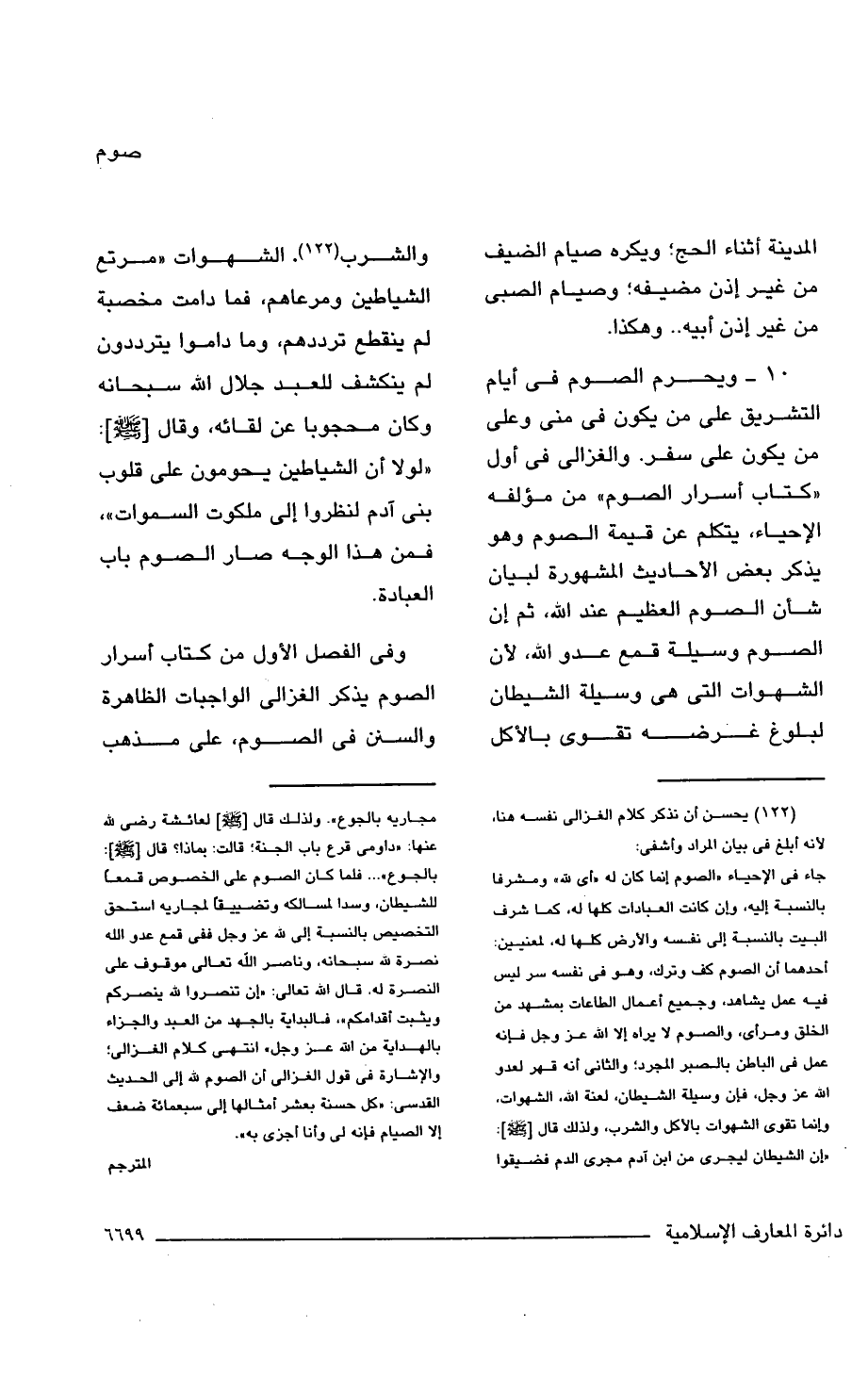 10 - ويحرم الصوم فى أيام التشريق على من يكون فى منى وعلى من يكون على سفر. والغزالى فى أول "كتاب أسرار الصوم"، من مؤلفه الإحياء، يتكلم عن قيمة الصوم وهو يذكر بعض الأحاديث المشهورة لبيان شأن الصوم العظيم عند اللَّه، ثم إن الصوم وسيلة قمع عدو اللَّه، لأن الشهوات التى هى وسيلة الشيطان لبلوغ غرضه تقوى بالأكل والشرب (¬122) الشهوات "مرتع الشياطين ومرعاهم، فما دامت مخصبة لم ينقطع ترددهم، وما داموا يترددون لم ينكشف للعبد جلال اللَّه سبحانه وكان محجوبا عن لقائه، وقال [-صلى اللَّه عليه وسلم-]: "لولا أن الشياطين يحومون على قلوب بنى آدم لنظروا إلى ملكوت السموات"، فمن هذا الوجه صار الصوم باب العبادة.