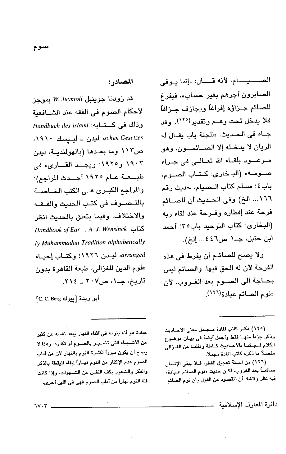 قد زودنا جوينبل W.Juyntoll بموجز لأحكام الصوم فى الفقه عند الشافعية وذلك فى كتابه; Handbuch des islami schen Gesetzes، ليدن - ليبسك 1910، ص 113 وما بعدها (بالهولندية، ليدن 1903 و 1925: ويجد القارئ فى طبعة عام 1925 أحدث المراجع)؛ والمراجع الكبرى هى الكتب الخاصة بالتصوف فى كتب الحديث والفقه والاختلاف. وفيما يتعلق بالحديث انظر كتاب Handbook of Early Muhammadan Tradition alphabetically arranged: A. J. Wensinck، ليدن؛ وكتاب إحياء علوم الدين للغزالى، طبعة القاهرة بدون تاريخ، جـ 1، ص 207 - 214.