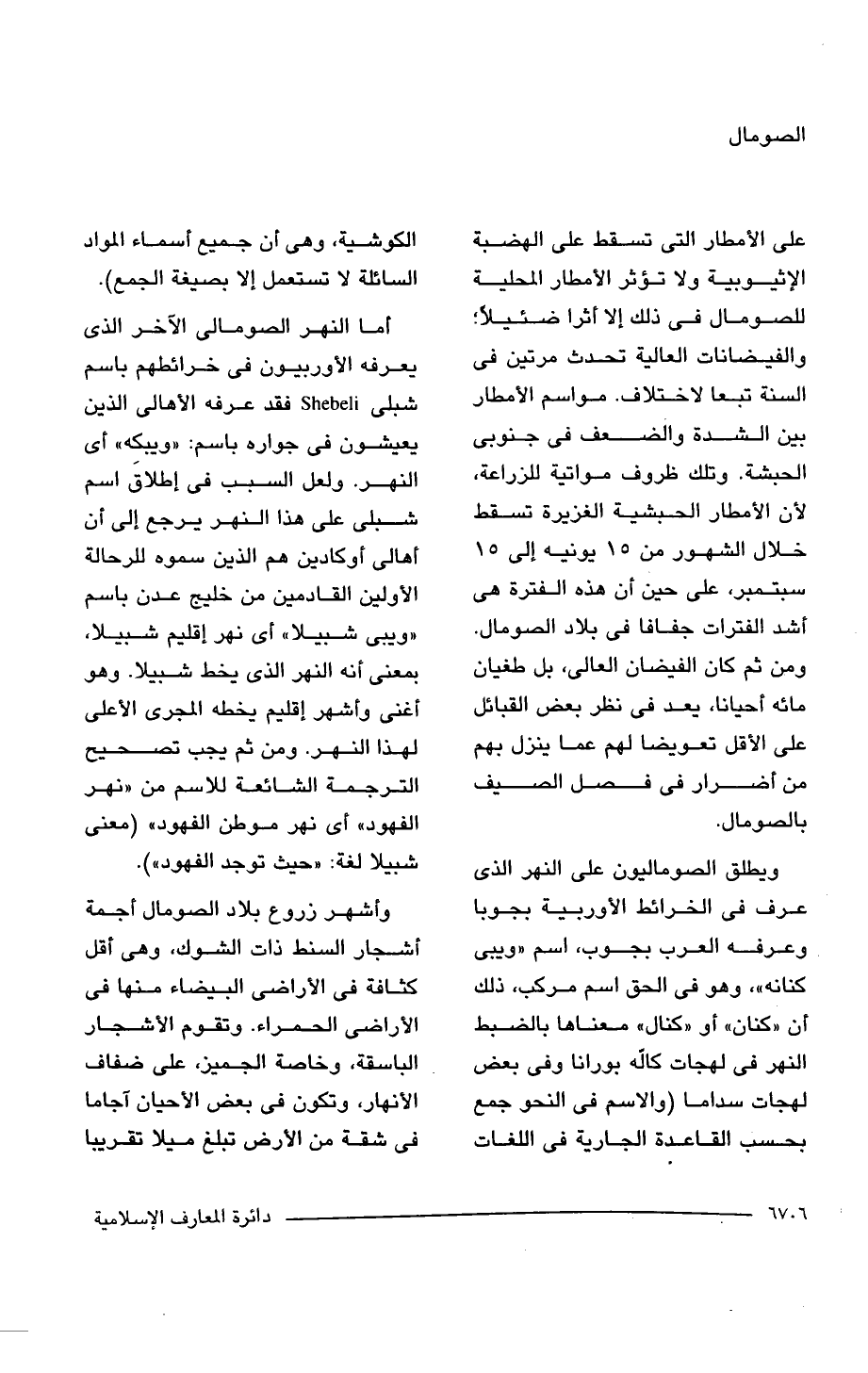 على الأمطار التى تسقط على الهضبة الإثيوبية ولا تؤثر الأمطار المحلية للصومال فى ذلك إلا أثرا ضئيلًا؛ والفيضانات العالية تحدث مرتين فى السنة تبعا لاختلاف. مواسم الأمطار بين الشدة والضعف فى جنوبى الحبشة. وتلك ظروف مواتية للزراعة، لأن الأمطار الحبشية الغزيرة تسقط خلال الشهور من 15 يونيه إلى 15 سبتمبر، على حين أن هذه الفترة هى أشد الفترات جفافا فى بلاد الصومال. ومن ثم كان الفيضان العالى، بل طغيان مائه أحيانا، يعد فى نظر بعض القبائل على الأقل تعويضا لهم عما ينزل بهم من أضرار فى فصل الصيف بالصومال.
