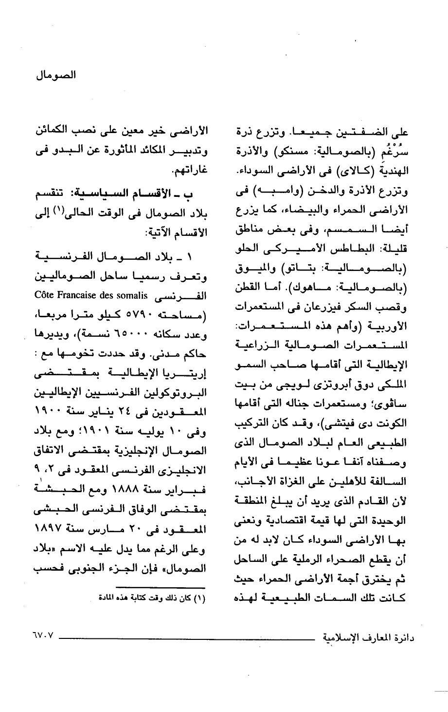 على الضفتين جميعا. وتزرع ذرة سُرْغُمِ (بالصومالية؛ مسنكو) والأذرة الهندية (كالاى) فى الأراضى السوداء. وتزرع الأذرة والدخن (وامبه) فى الأراضى الحمراء والبيضاء، كما يزرع أيضا السمسم، وفى بعض مناطق قليلة: البطاطس الأميركى الحلو (بالصومالية: بتاتو) والميوق (بالصومالية: ماهوك). أما القطن وقصب السكر فيزرعان فى المستعمرات الأوربية (وأهم هذه المستعمرات: المستعمرات الصومالية الزراعية الإيطالية التى أقامها صاحب السمو الملكى دوق أبروتزى لويجى من بيت سافوى؛ ومستعمرات جناله التى أقامها الكونت دى فيتشى)، وقد كان التركيب الطبيعى العام لبلاد الصومال الذى وصفناه آنفا عونا عظيما فى الأيام السالفة للأهلين على الغزاة الأجانب، لأن القادم الذى يريد أن يبلغ المنطقة الوحيدة التى لها قيمة اقتصادية ونعنى بها الأراضى السوداء كان لابد له من أن يقطع الصحراء الرملية على الساحل ثم يخترق أجمة الأراضى الحمراء حيث كانت لكل السمات الطبيعية لهذه الأراضى خير معين على نصب الكمائن وتدبير المكائد المأثورة عن البدو فى غاراتهم.