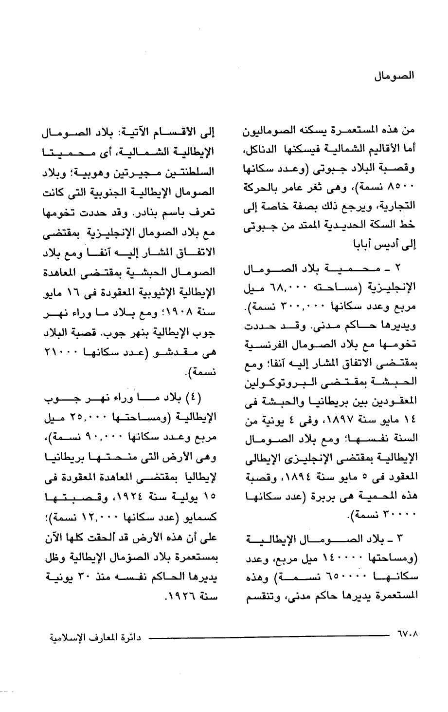 3 - بلاد الصومال الإيطالية (ومساحتها 14000 ميل مربع، وعدد سكانها 65000 نسمة) وهذه المستعمرة يديرها حاكم مدنى، وتنقسم إلى الأقسام الآتية: بلاد الصومال الإيطالية الشمالية، أى محميتا السلطنتين مجيرتين وهوبية؛ وبلاد الصومال الإيطالية الجنوبية التى كانت تعرف باسم بنادر. وقد حددت تخومها مع بلاد الصومال الإنجليزية بمقتضى الاتفاق المشار إليه آنفا ومع بلاد الصومال الحبشية بمقتضى المعاهدة الإيطالية الإثيوبية المعقودة فى 16 مايو سنة 1908؛ ومع بلاد ما وراء نهر جوب الإيطالية بنهر جوب. قصبة البلاد هى مقدشو (عدد سكانها 2100 نسمة).