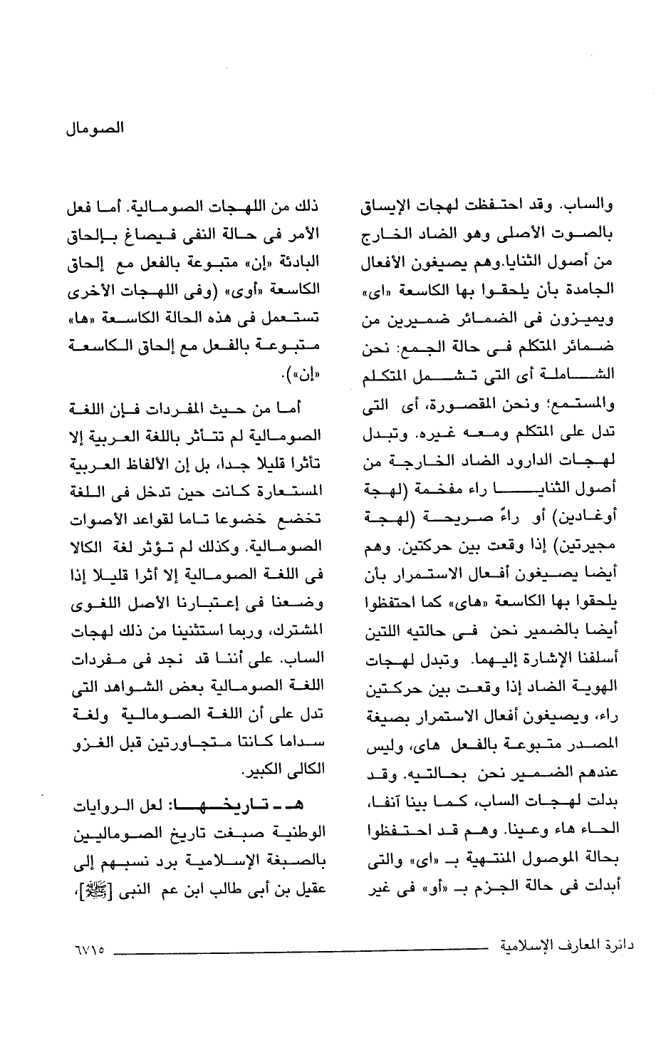 والساب. وقد احتفظت لهجات الإيساق بالصوت الأصلى وهو الضاد الخارج من أصول الثنايا. وهم يصيغون الأفعال الجامدة بأن يلحقوا بها الكاسعة "اى" ويميزون فى الضمائر ضميرين من ضمائر المتكلم فى حالة الجمع: نحن الشاملة أى التى تشمل المتكلم والمستمع؛ ونحن المقصورة، أى التى تدل على المتكلم ومعه غيره. وتبدل لهجات الدارود الضاد الخارجة من أصول الثنايا راء مفخمة (لهجة أوغادين) أو راءً صريحة (لهجة مجيرتين) إذا وقعت بين حركتين. وهم أيضا يصيغون أفعال الاستمرار بأن يلحقوا بها الكاسعة، "هاى" كما احتفظوا أيضا بالضمير نحن فى حالتيه اللتين أسلفنا الإشارة إليهما. وتبدل لهجات الهوية الضاد إذا وقعت بين حركتين راء، ويصيغون أفعال الاستمرار بصيغة المصدر متبوعة بالفعل هاى، وليس عندهم الضمير نحن بحالتيه. وقد بدلت لهجات الساب، كما بينا آنفا، الحاء هاء وعينا. وهم قد احتفظوا بحالة الموصول المنتهية بـ "اى" والتى أبدلت فى حالة الجزم بـ "أو"، فى غير ذلك من اللهجات الصومالية. أما فعل الأمر فى حالة النفى فيصاغ بإلحاق البادئة "إن" متبوعة بالفعل مع إلحاق الكاسعة "أوى" (وفى اللهجات الأخرى تستعمل فى هذه الحالة الكاسعة "بها" متبوعة بالفعل مع إلحاق الكاسعة "إن").