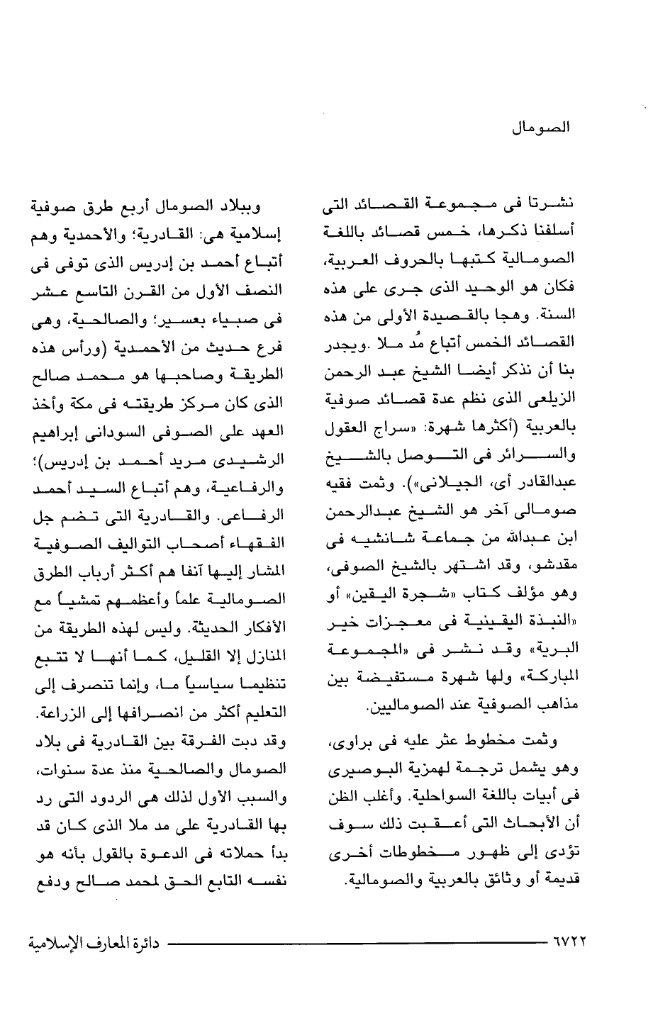 وببلاد الصومال أربع طرق صوفية إسلامية هى: القادرية؛ والأحمدية وهم أتباع أحمد بن إدريس الذى توفى فى النصف الأول من القرن التاسع عشر فى صبياء بعسير؛ والصالحية، وهى فرع حديث من الأحمدية (ورأس هذه الطريقة وصاحبها هو محمد صالح الذى كان مركز طريقته فى مكة وأخذ العهد على الصوفى السودانى إبراهيم الرشيدى مريد أحمد بن إدريس)؛ والرفاعية، وهم أتباع السيد أحمد الرفاعى. والقادرية التى تضم جل الفقهاء أصحاب التواليف الصوفية المشار إليها آنفا هم أكثر أرباب الطرق الصومالية علما وأعظمهم تمشيا مع الأفكار الحديثة. وليس لهذه الطريقة من المنازل إلا القليل، كما أنها لا تتبع تنظيما سياسيًا ما، وإنما تنصرف إلى التعليم أكثر من انصرافها إلى الزراعة. وقد دبت الفرقة بين القادرية فى بلاد الصومال والصالحية منذ عدة سنوات، والسبب الأول لذلك هى الردود التى رد بها القادرية على مد ملا الذى كان قد بدأ حملاته فى الدعوة بالقول بأنه هو نفسه التابع الحق لمحمد صالح ودفع
