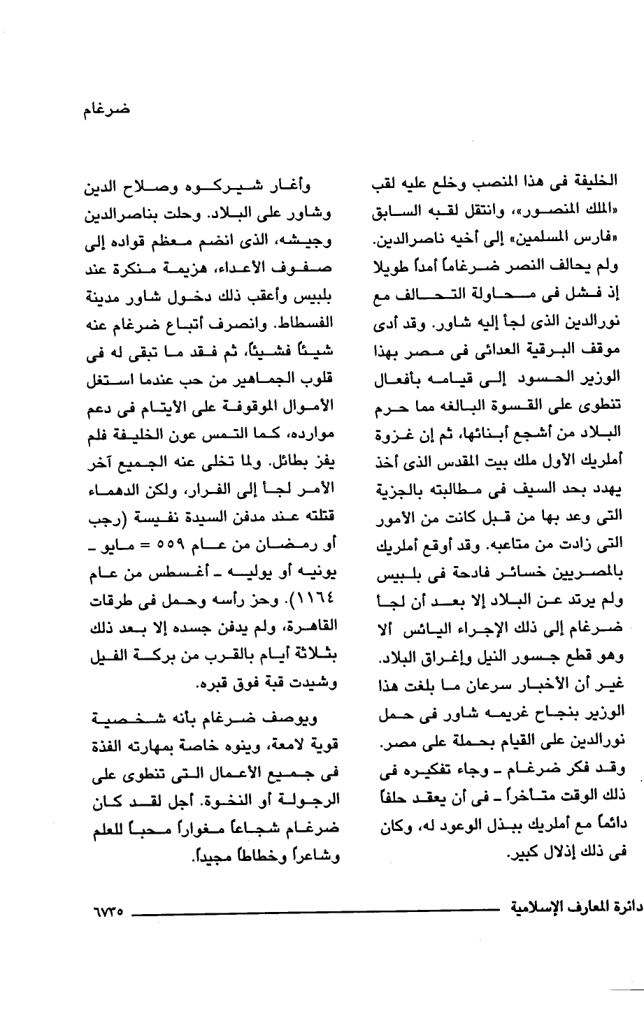 الخليفة فى هذا المنصب وخلع عليه لقب "الملك المنصور"، وانتقل لقبه السابق "فارس المسلمين" إلى أخيه ناصر الدين. ولم يحالف النصر ضرغاما أمدًا طويلا إذ فشل فى محاولة التحالف مع نور الدين الذى لجأ إليه شاور. وقد أدى موقف البرقية العدائى فى مصر بهذا الوزير الحسود إلى قيامه بأفعال تنطوى على القسوة البالغه مما حرم البلاد من أشجع أبنائها، ثم إن غزوة أملريك الأول ملك بيت المقدس الذى أخذ يهدد بحد السيف فى مطالبته بالجزية التى ومحمد بها من قبل كانت من الأمور التى زادت من متاعبه. وقد أوقع أملريك بالمصريين خسائر فادحة فى بلبيس ولم يرتد عن البلاد إلا بعد أن لجأ ضرغام إلى ذلك الإجراء اليائس ألا وهو قطع جسور النيل وإغراق البلاد. غير أن الأخبار سرعان ما بلغت هذا الوزير بنجاح غريمه شاور فى حمل نور الدين على القيام بحملة على مصر. وقد فكر ضرغام -وجاء تفكيره فى ذلك الوقت متأخرًا- فى أن يعقد حلفًا دائما مع أملريك ببذل الوعود له، وكان فى ذلك إذلال كبير.