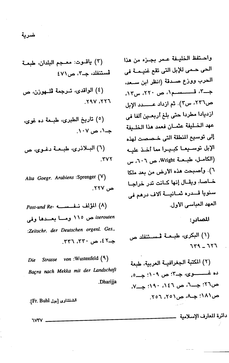 واحتفظ الخليفة عمر بجزء من هذا الحى حمى للإبل التى تقع غنيمة فى الحرب ووزع صدقة (انظر ابن سعد، جـ 3، قسم 1، ص 220، س 13، ص 236, س 3). ثم ازداد عدد الإبل ازديادا مطردا حتى بلغ أربعين ألفا فى عهد الخليفة عثمان فعمد هذا الخليفة إلى توسيع المنطقة التى خصصت لهذه الإبل توسيع كبيرا مما أخذ عليه (الكامل، طبعة Wright، ص 606، س 6). وأصبحت هذه الأرض من بعد ملكا خاصا، ويقال إنها كانت تدر خراجا سنويا قدره ثمانية آلف درهم فى العهد العباسى الأول.