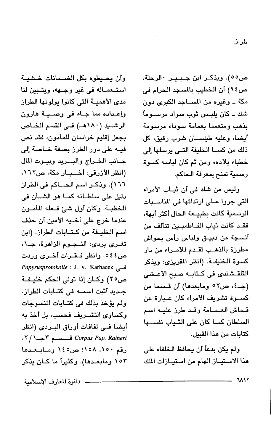 ولم يكن بدعًا أن يحافظ الخلفاء على هذا الامتياز الهام من امتيازات الملك وأن يحيطوه بكل الضمانات خشية استعماله فى غير وجهه، ويتبين لنا مدى الأهمية التى كانوا يولونها الطراز وإعداده مما جاء فى وصية هارون الرشيد (180 هـ) فى القسم الخاص بجعل إقليم خراسان للمأمون، فقد نص فيه على دور الطرز بصفة خاصة إلى جانب الخراج والبريد وبيوت المال (انظر الأزرقى: أخبار مكة، ص 162 - 166) وذكر اسم الحاكم فى الطراز دليل على سلطانه كما هو الشأن فى الخطبة. وكان أول شئ فعله المأمون عندما خرج على أخيه الأمين أن حذف اسم الخليفة من كتابات الطراز. (ابن تغرى بردى: النجوم الزاهرة، جـ 1، ص 544، وانظر فقرات أخرى وردت فى Papyrusprotokolle: J. v. Karbacek ص 25) وكان إذا تولى الحكم خليفة جديد أثبت اسمه فى كتابات الطراز. ولم يؤخذ بذلك فى كتابات المنسوجات وكساوى التشريف فحسب، جل أخذ به أيضًا فى لفافات أوراق البردى (انظر Corpus Pap. Raineri قسم 3 جـ 1/ 2، رقم 150، 158؛ ص 145 وما بعدها 153 وما بعدها). وكثيرًا ما كان يذكر