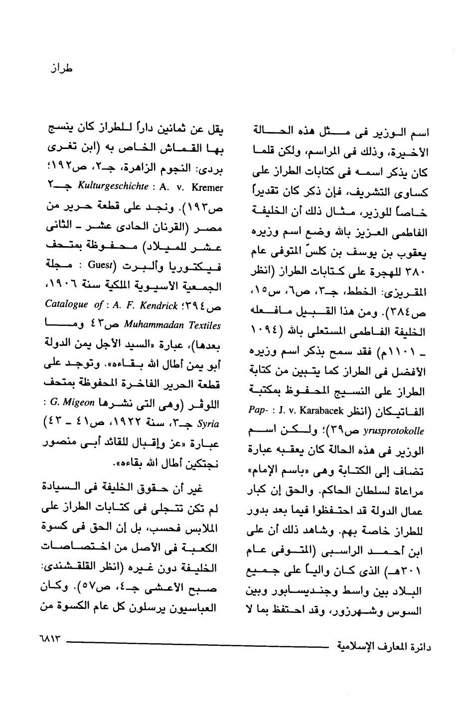 اسم الوزير فى مثل هذه الحالة الأخيرة، وذلك فى المراسم، ولكن قلما كان يذكر اسمه فى كتابات الطراز على كساوى التشريف، فإن ذكر كان تقديرًا خاصًا للوزير، مثال ذلك أن الخليفة الفاطمى العزيز باللَّه وضع اسم وزيره يعقوب بن يوسف بن كلسّ المتوفى عام 380 للهجرة على كتابات الطراز (انظر المقريزى: الخطط، جـ 3، ص 6، س 15، ص 384). ومن هذا القبيل ما فعله الخليفة الفاطمى المستعلى باللَّه (1094 - 1101 م) فقد سمح بذكر اسم وزيره الأفضل فى الطراز كما يتبين من كتابة الطراز على النسيج المحفوظ بمكتبة الفاتيكان (انظر Papyrusprotokolle: J. v. Karabacek ص 39)؛ ولكن اسم الوزير فى هذه الحالة كان يعقبه عبارة تضاف إلى الكتابة وهى "باسم الإمام" مراعاة لسلطان الحاكم. والحق إن كبار عمال الدولة قد احتفظوا فيما بعد بدور للطراز خاصة بهم. وشاهد ذلك أن على ابن أحمد الراسبى (المتوفى عام 130 هـ) الذى كان واليًا على جميع البلاد بين واسط وجنديسابور وبين السوس وشهرزور، وقد احتفظ بما لا يقل عن ثمانين دارًا للطراز كان ينسج بها القماش الخاص به (ابن تغرى بردى: النجوم الزاهرة، جـ 2، ص 192؛ A.v.Kremer: Kulturgeschichte جـ 2 ص 193). ونجد على قطعة حرير من مصر (القرنان الحادى عشر - الثانى عشر للميلاد) محفوظة بمتحف فيكتوريا وألبرت (Guess: مجلة الجمعية الأسيوية الملكية سنة 1906، ص 394؛ A.F.Kendrick: Catalogue of Muhammadan Textiles ص 43 ما بعدها)، عبارة "السيد الأجل يمن الدولة أبو يمن أطال اللَّه بقاءه". وتوجد على قطعة الحرير الفاخرة المحفوظة بمتحف اللوفر (وهى التى نشرها Syria: G. Migeon جـ 3، سنة 1922، ص 41 - 43) عبارة "عز وإقبال للقائد أبى منصور نجتكين أطال اللَّه بقاءه".