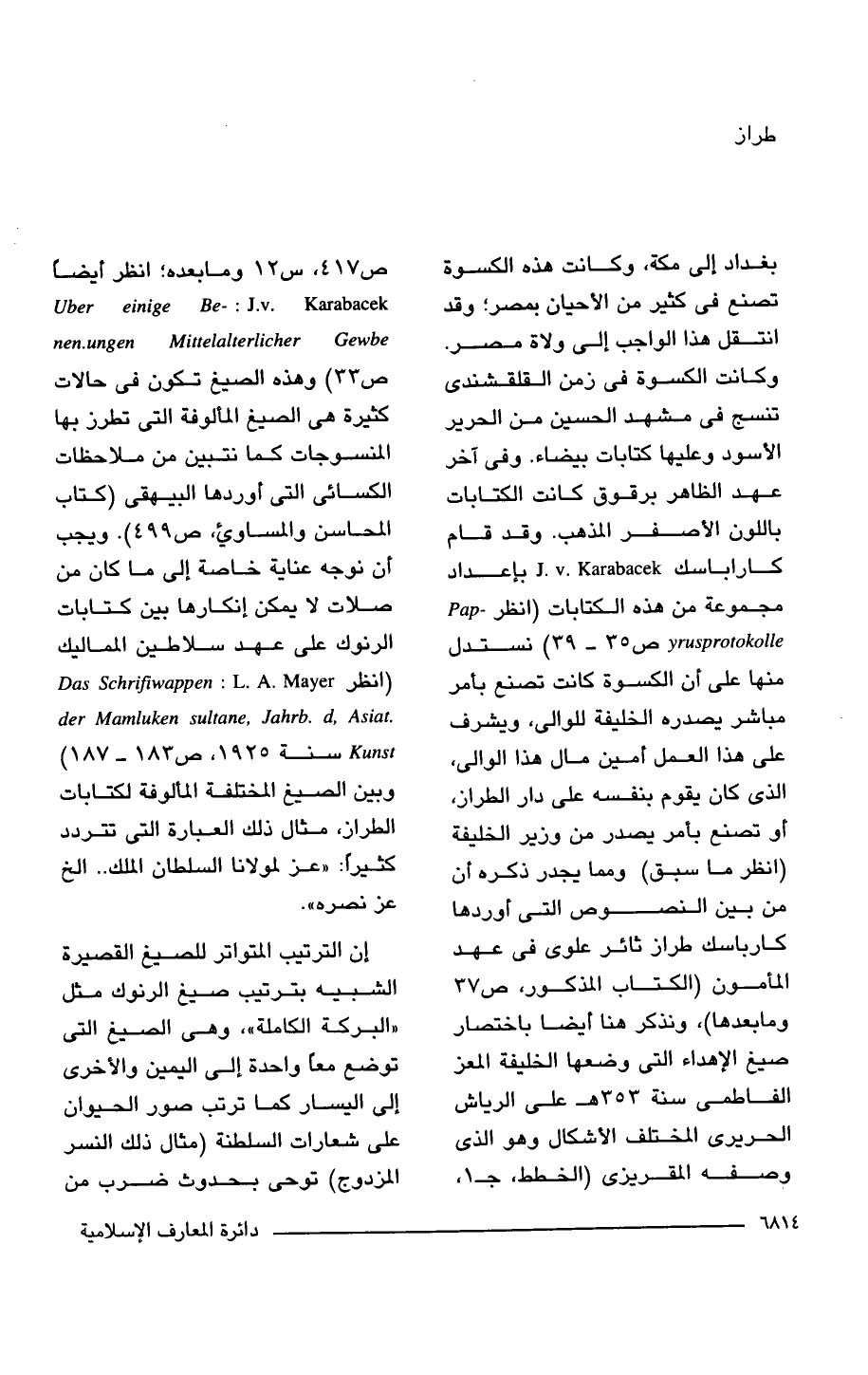 بغداد إلى مكة، وكانت هذه الكسوة تصنع فى كثير من الأحيان بمصر؛ وقد انتقل هذا الواجب إلى ولاة مصر. وكانت الكسوة فى زمن القلقشندى تنسج فى مشهد الحسين من الحرير الأسود وعليها كتابات بيضاء. وفى آخر عهد الظاهر برقوق كانت الكتابات باللون الأصفر المذهب. وقد قام كاراباسك J.v.Karabacek بإعداد مجموعة من هذه الكتابات (انظر Papyrusprotokolle ص 35 - 39) نستدل منها على أن الكسوة كانت تصنع بأمر مباشر يصدره الخليفة للوالى، ويشرف على هذا العمل أمين مال هذا الوالى، الذى كان يقوم بنفسه على دار الطراز، أو تصنع بأمر يصدر من وزير الخليفة (انظر ما سبق) ومما يجدر ذكره أن من بين النصوص التى أوردها كارباسك طراز ثائر علوى فى عهد المأمون (الكتاب المذكور، ص 37 وما بعدها)، ونذكر هنا أيضًا باختصار صيغ الإهداء التى وضعها الخليفة المعز الفاطمى سنة 353 هـ على الرياش الحريرى المختلف الأشكال وهو الذى وصفه المقريزى (الخطط، جـ 1، ص 417، س 12 وما بعده؛ انظر أيضًا Uber einige Benen.ungen Mittelalterlicher Gewbe: J.v. Karabacek ص 33) وهذه الصيغ تكون فى حالات كثيرة هى الصيغ المألوفة التى تطرز بها المنسوجات كما نتبين من ملاحظات الكسائى التى أوردها البيهقى (كتاب المحاسن والمساوئ، ص 499). ويجب أن نوجه عناية خاصة إلى ما كان من صلات لا يمكن إنكارها بين كتابات الرنوك على عهد سلاطين المماليك (انظر Das Schrifiwappen der Mamluken sultane, Jahrb. d, Asiat. Kunst: L. A. Mayer سنة 1925، ص 183 - 187) وبين الصيغ المختلفة المألوفة لكتابات الطراز، مثال ذلك العبارة التى تتردد كثيرًا: "عز لمولانا السلطان الملك. . الخ عز نصره".