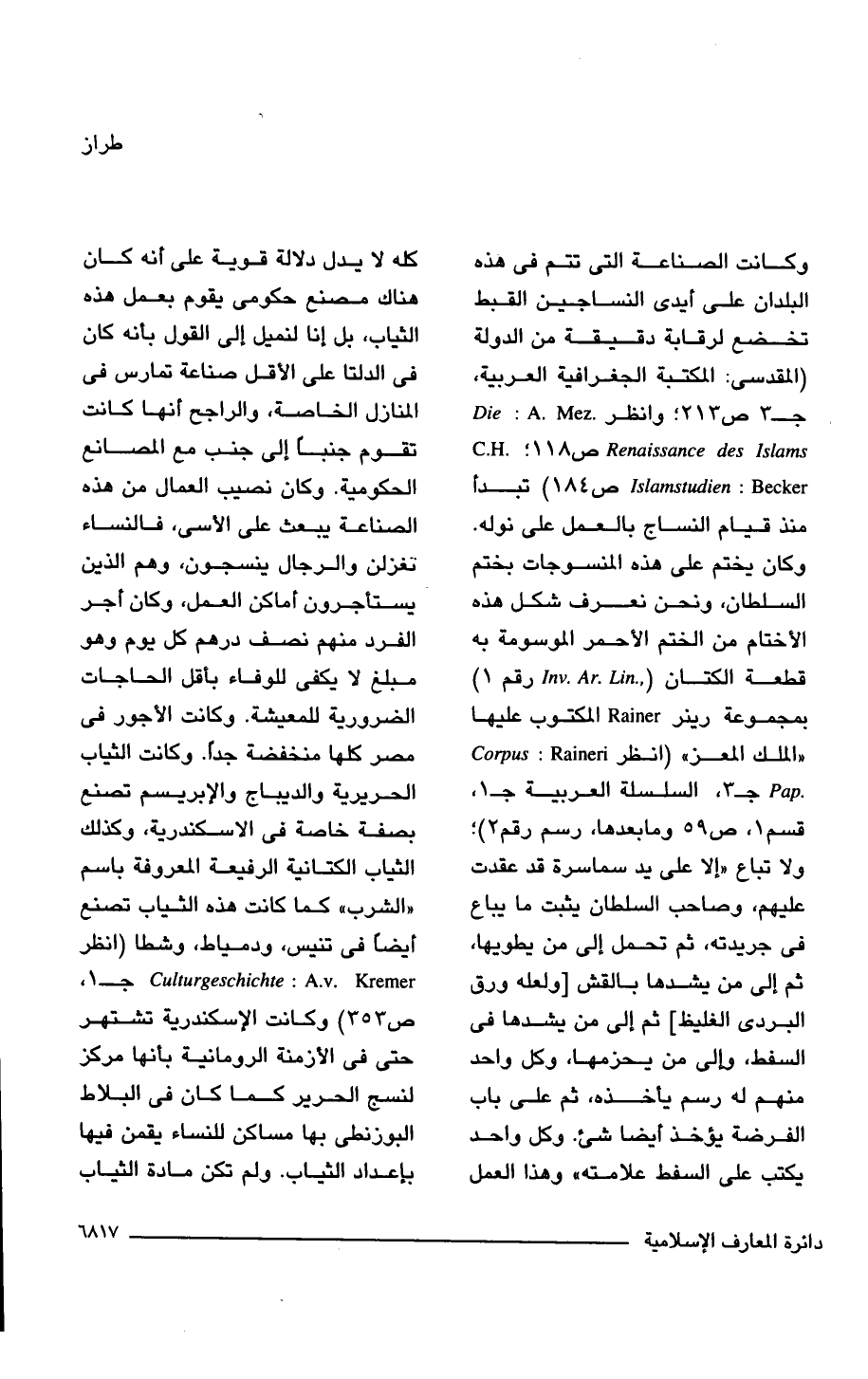 وكانت الصناعة التى تتم فى هذه البلدان على أيدى النساجين القبط تخضع لرقابة دقيقة من الدولة (المقدسى: المكتبة الجغرافية العربية، جـ 3 ص 213؛ وانظر Die Renaissance des Islams: A.Mez ص 118؛ Islamstudien: C.H.Becker ص 184) تبدأ منذ قيام النساج بالعمل على نوله. وكان يختم على هذه المنسوجات بختم السلطان، ونحن نعرف شكل هذه الأختام من الختم الأحمر الموسومة به قطعة الكتان (Inv. Ar. Lin رقم 1) بمجموعة رينر Rainer المكتوب عليها "الملك المعز" (انظر Corpus Pap: Rained جـ 3، السلسلة العربية جـ 1، قسم 1، ص 59 وما بعدها، رسم رقم 2)؛ ولا تباع "إلا على يد سماسرة قد عقدت عليهم، وصاحب السلطان يثبت ما يباع فى جريدته، ثم تحمل إلى من يطويها، ثم إلى من يشدها بالقشى [ولعله ورق البردى الغليظ] ثم إلى من يشدها فى السفط، وإلى من يحزمها، واحد منهم له رسم يأخذه، ثم على باب الفرضة يؤخذ أيضًا شئ. وكل واحد يكتب على السفط علامته" وهذا العمل كله لا يدل دلالة قوية على أنه كان هناك مصنع حكومى يقوم بعمل هذه الثياب، بل إنا لنميل إلى القول بأنه كان فى الدلتا على الأقل صناعة تمارس فى المنازل الخاصة، والراجح أنها كانت تقوم جنبًا إلى جنب مع المصانع الحكومية. وكان نصيب العمال من هذه الصناعة يبعث على الأسى، فالنساء تغزلن والرجال ينسجون، وهم الذين يستأجرون أماكن العمل، وكان أجر الفرد منهم نصف درهم كل يوم وهو مبلغ لا يكفى للوفاء بأقل الحاجات الضرورية للمعيشة. وكانت الأجور فى مصر كلها منخفضة جدًّا. وكانت الثياب الحريرية والديباج والابريسم تصنع بصفة خاصة فى الإسكندرية، وكذلك الثياب الكتانية الرفيعة المعروفة باسم "الشرب" كما كانت هذه الثياب تصنع أيضًا فى تنيس، ودمياط، وشطا (انظر Culturgeschichte: A.v. Kremer جـ 1، ص 353) وكانت الاسكندرية تشتهر حتى فى الأزمنة الرومانية بأنها مركز لنسج الحرير كما كان فى البلاط البوزنطى بها مساكن للنساء يقمن فيها بإعداد الثياب. ولم تكن مادة الثياب