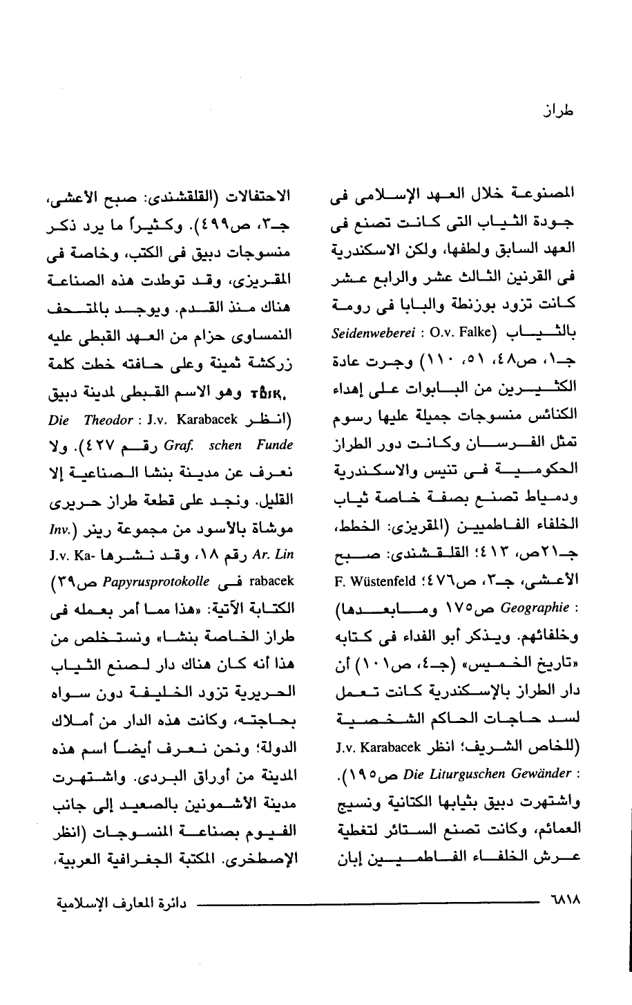 المصنوعة خلال العهد الإسلامى فى جودة الثياب التى كانت تصنع فى العهد السابق ولطفها، ولكن الاسكندرية فى القرنين الثالث عشر والرابع عشر كانت تزود بوزنطة والبابا فى رومة بالثياب (Seidenweberei: O.v. Falke جـ 1، ص 48، 51، 110) وجرت عادة الكثيرين من البابوات على إهداء الكنائس منسوجات جميلة عليها رسوم تمثل الفرسان وكانت دور الطراز الحكومية فى تنيس والاسكندرية ودمياط تصنع بصفة خاصة ثياب الخلفاء الفاطميين (المقريزى: الخطط، جـ 21 ص 413؛ القلقشندى: صبح الأعشى، جـ 3، ص 476 Geographie: F.Wustenfeld ص 175 وما بعدها) وخلفائهم. ويذكر أبو الفداء فى كتابه "تاريخ الخميس" (جـ 4، ص 101) أن دار الطراز بالإسكندرية كانت تعمل لسد حاجات الحاكم الشخصية (للخاص الشريف؛ انظر 1070 Die Liturguschen Gewander: J.v.Karabacek ص 195). واشتهرت دبيق بثيابها الكتانية ونسيج العمائم، وكانت تصنع الستائر لتغطية عرش الخلفاء الفاطميين إبان الاحتفالات (القلقشندى: صبح الأعشى، جـ 3، ص 499). وكثيرًا ما يرد ذكر منسوجات دبيق فى الكتب، وخاصة فى المقريزى، وقد توطدت هذه الصناعة هناك منذ القدم. ويوجد بالمتحف النمساوى حزام من العهد القبطى عليه زركشة ثمينة وعلى حافته خطت كلمة وهو الاسم القبطى لمدينة دبيق (انظر Die Theodor Graf. schen Funde: J.v. Karabacek رقم 427). ولا نعرف عن مدينة بنشا الصناعية إلا القليل. ونجد على قطعة طراز حريرى موشاة بالأسود من مجموعة رينر (Inv.Ar.Lin رقم 18، وقد نشرها J.v.Karabacek فى Papyrusprotokolle ص 39) الكتابة الآتية: "هذا مما أمر بعمله فى طراز الخاصة بنشا" ونستخلص من هذا أنه كان هناك دار لصنع الثياب الحريرية تزود الخليفة دون سواه بحاجته، وكانت هذه الدار من أملاك الدولة؛ ونحن نعرف أيضًا اسم هذه المدينة من أوراق البردى. واشتهرت مدينة الأشمونين بالصعيد إلى جانب الفيوم بصناعة المنسوجات (انظر الإصطخرى. المكتبة الجغرافية العربية،