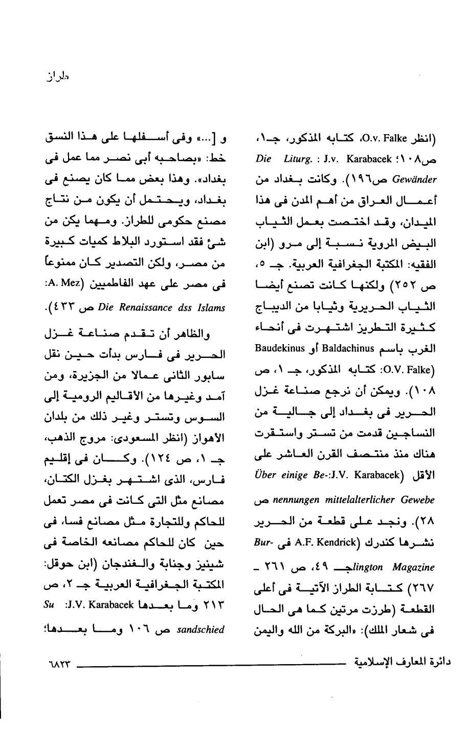 (انظر O.v. Falke، كتابه المذكور، جـ 1، ص 108؛ Die Liturg. Gewander: J.v. Karabacek ص 196) وكانت بغداد من أعمال العراق من أهم المدن فى هذا الميدان، وقد اختصت بعمل الثياب البيض المروية نسبة إلى مرو (ابن الفقيه: المكتبة الجغرافية العربية. جـ 5، ص 252) ولكنها كانت تصنع أيضًا الثياب الحريرية وثيابًا من الديباج كثيرة التطريز اشتهرت فى أنحاء الغرب باسم Baudekinus أو Baldachinus (O.V. Falke: كتابه المذكور، جـ 1، ص 108). ويمكن أن نرجع صناعة غزل الحرير فى بغداد إلى جالية من النساجين قدمت من تستر واستقرت هناك منذ منتصف القرن العاشر على الأقل (Uber einige Benennungen mittelalterlicher Gewebe: J.V. Karabacek, ص 28). ونجد على قطعة من الحرير نشرها كندرك (A.F. Kendrick فى Burlington Magazine جـ 49، ص 261 - 267) كتابة الطراز الآتية فى أعلى القطعة (طرزت مرتين كما هى الحال فى شعار الملك): "البركة من اللَّه واليمن و [. . . " وفى أسفلها على هذا النسق خط: "بصاحبه أبى نصر مما عمل فى بغداد". وهذا بعض مما كان يصنع فى بغداد، ويحتمل أن يكون من نتاج مصنع حكوص للطراز. ومهما يكن من شئ فقد استورد البلاط كميات كبيرة من مصر، ولكن التصدير كان ممنوعًا فى مصر على عهد الفاطميين (Die Renaissance dss Islams: A. Mez ص 433).