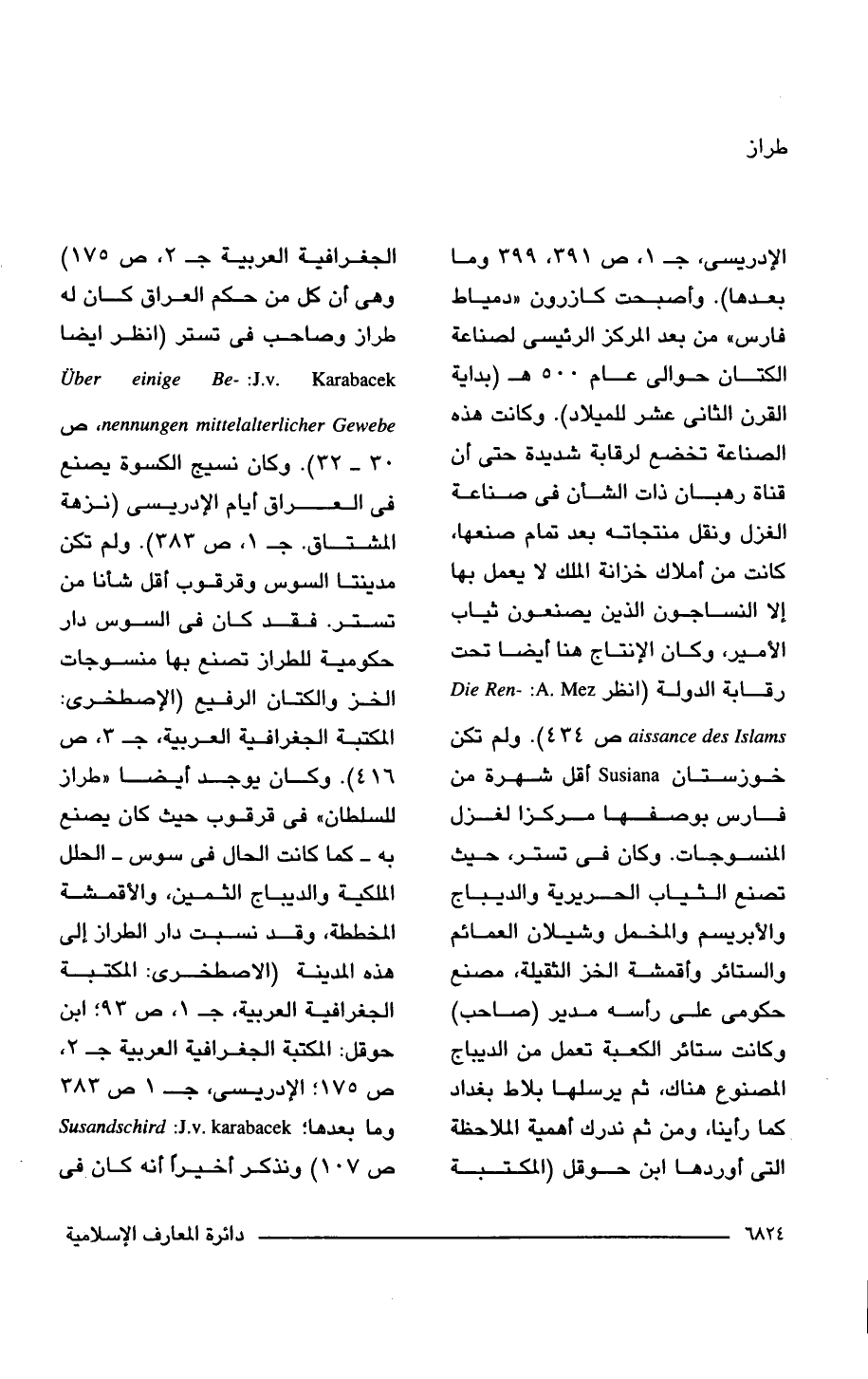الإدريسى، جـ 1، ص 391، 399 وما بعدها). وأصبحت كازرون "دمياط فارس" من بعد المركز الرئيسى لصناعة الكتان حوالي عام 500 هـ (بداية القرن الثانى عشر للميلاد). وكانت هذه الصناعة تخضع لرقابة شديدة حتى أن قناة رهبان ذات الشأن فى صناعة الغزل ونقل منتجاته بعد تمام صنعها، كانت من أملاك خزانة الملك لا يعمل بها إلا النساجون الذين يصنعون ثياب الأمير، وكان الإنتاج هنا أيضًا تحت رقابة الدولة (انظر Dip Renaissance des Islams: A. Mez ص 434). لم تكن خوزستان Suciana أقل شهرة من فارس بوصفها مركزا لغزل المنسوجات. وكان فى تستر، حيث تصنع الثياب الحريرية والديباج والأبريسم والمخمل وشيلان العمائم والستائر وأقمشة الخز الثقيلة، مصنع حكومى على رأسه مدير (صاحب) وكانت ستائر الكعبة تعمل من الديباج المصنوع هناك، ثم يرسلها بلاط بغداد كما رأينا، ومن ثم ندرك أهمية الملاحظة التى أوردها ابن حوقل (المكتبة الجغرافية العربية جـ 2، ص 175) وهى أن كل من حكم العراق كان له طراز وصاحب فى تستر (انظر أيضًا Uber einige Benenungen mittelalterlicher Gewebe: J.v. Karabacek، ص 30 - 32). وكان نسيج الكسوة يصنع فى العراق أيام الإدريسى (نزهة المشتاق، جـ 1، ص 383). ولم تكن مدينتا السوس وقرقوب أقل شأنا من تستر. فقد كان فى السوس دار حكومية للطراز تصنع بها منسوجات الخز والكتان الرفيع (الإصطخرى: المكتبة الجغرافية العربية، جـ 3، ص 416). وكان يوجد أيضًا "طراز للسلطان" فى قرقوب حيث كان يصنع به -كما كانت الحال فى سوس- الحلل الملكية والديباج الثمين، والأقمشة المخططة، وقد نسبت دار الطراز إلى هذه المدينة (الاصطخرى: المكتبة الجغرافية العربية، جـ 1، ص 93؛ ابن حوقل: المكتبة الجغرافية العربية جـ 2، ص 175؛ الإدريسى، جـ 1، ص 383 وما بعدها؛ Susandschird: J.v. karabacek ص 107) ونذكر أخيرًا أنه كان فى
