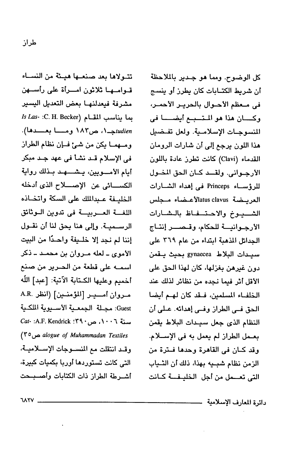 كل الوضوح. ومما هو جدير بالملاحظة أن شريط الكتابات كان يطرز أو ينسج فى معظم الأحوال بالحرير الأحمر، وكان هذا هو المتبع أيضًا فى المنسوجات الإسلامية. ولعل تفضيل هذا اللون يرجع إلى أن شارات الرومان القدماء (Clavi) كانت تطرز عادة باللون الأرجوانى. ولقد كان الحق المخول للرؤساء Princeps فى إهداء الشارات العريضة latus clavus لأعضاء مجلس الشيوخ والاحتفاظ بالشارات الأرجوانية للحكام، وقصر إنتاج الجدائل المذهبة ابتداء من عام 369 على سيدات البلاط gynaecea بحيث يقمن دون غيرهن بغزلها، كان لهذا الحق على الأقل أثر فيما نجده من نظائر لذلك عند الخلفاء المسلمين، فقد كان لهم أيضًا الحق فى الطراز وفى إهدائه. على أن النظام الذى جعل سيدات البلاط يقمن بعمل الطراز لم يعمل به فى الإسلام. وقد كان فى القاهرة وحدها فترة من الزمن نظام شبيه بهذا، ذلك أن الثياب التى تعمل من أجل الخليفة كانت تتولاها بعد صنعها هيئة من النساء قوامها ثلاثون امرأة على رأسهن مشرفة فيعدلنها بعض التعديل اليسير بما يناسب المقام (Is Lastudien: C.H.Becker جـ 1، ص 183, وما بعدها). ومهما يكن من شئ فإن نظام الطراز فى الإسلام قد نشأ فى عهد جد مبكر أيام الأمويين، يشهد بذلك رواية الكسائى عن الإصلاح الذى أدخله الخليفة عبد الملك على السكة واتخاذه اللغة العربية فى تدوين الوثائق الرسمية. وإلى هنا يحق لنا أن نقول إننا لم نجد إلا خليفة واحدًا من البيت الأموى -لعله مروان بن محمد- ذكر اسمه على قطعة من الحرير من صنع أخميم وعليها الكتابة الآتية: [عبد] اللَّه مروان أمير [المؤمنين] (انظر A.R.Guest: مجلة الجمعية الآسيوية الملكية سنة 1006، ص 390؛ Catalogue of Muhammadan Textiles: A.F. Kendrick ص 35) وقد انتقلت مع المنسوجات الإسلامية، التى كانت تستوردها أوربا بكميات كبيرة، أشرطة الطراز ذات الكتابات وأصبحت