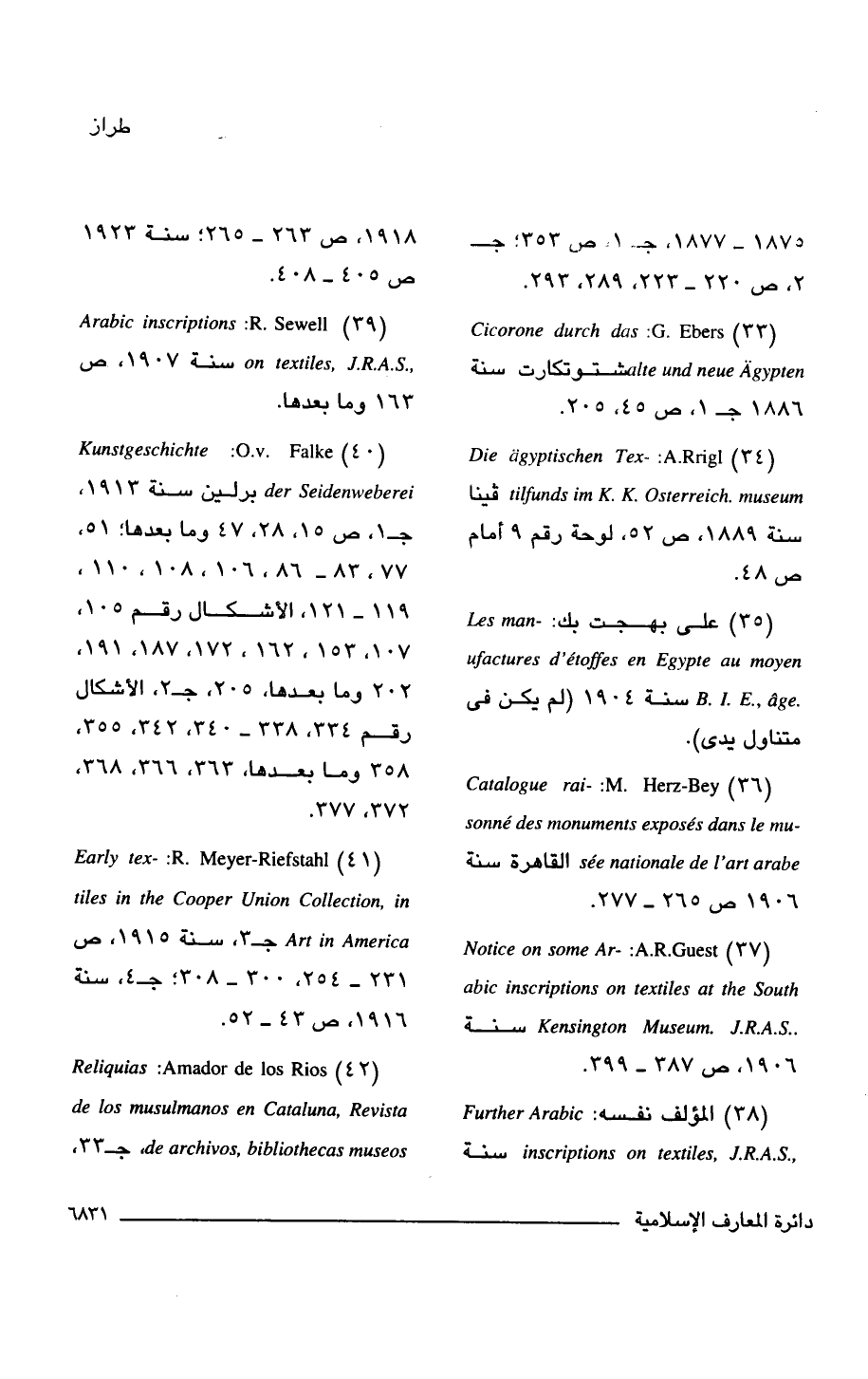 (37) Notice on some Arabic inscriptions on textiles at the South Kensington Museum. J.R.A.S: A.R.Guest سنة: 1906، ص 387 - 399.