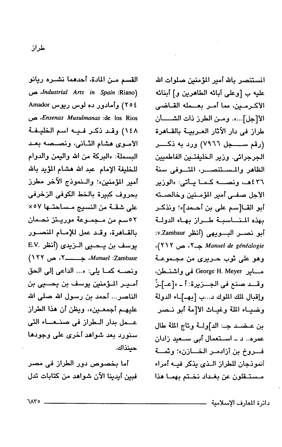 المستنصر باللَّه أمير المؤمنين صلوات اللَّه عليه ب [وعلى آبائه الطاهرين و] أبنائه الأكرمين، مما أمر بعمله القاضى الأ [جل]. . . ". ومن الطرز ذات الشأن طراز فى دار الآثار العربية بالقاهرة (رقم سجل 7966) ورد به ذكر الجرجرائى. وزير الخليفتين الفاطميين الظاهر والمستنصر، المتوفى سنة 436 هـ، ونصه كما يأتى: "الوزير الأجل صفى أمير المؤمنين وخالصته أبو القا [سم على بن أحمد] "؛ ونذكر بهذه المناسبة طراز بهاء الدولة أبو نصر البويهى (انظر Manuel de genealogie: v.Zambaur جـ 2، ص 212)، وهو على ثوب حريرى من مجموعة ماير George H. Meyer واشنطن، وقد صنع فى الجزيرة: أ - " [عـ]ــزّ وإقبال لملك الملوك د. . . ب [بهـ]ــاء الدولة وضياء الملة وغياث الأ [مة أبو نصر بن عضد جـ: الد] ولة وتاج الملة طال عمره. . د- استعمال أبى سعيد زادان فروخ بن آزادمر الخازن"؛ وثمة أنموذجان للطراز الذى يذكر فيه أمراء مستقلون عن بغداد نختم بهما هذا القسم من المادة، أحدهما نشره ريانو (Industrial Arts in Spain: Riano ص 254) وأمادور ده لوس ريوس Musulmanas: Amador de los Rios Ensenas، ص 148) وقد ذكر فيه اسم الخليفة الأموى هشام الثانى، ونصه بعد البسملة: "البركة من اللَّه واليمن والدوام للخليفة الإمام عبد اللَّه هشام المؤيد باللَّه أمير الموْمنين"؛ والنموذج الآخر مطرز بحروف كبيرة بالخط الكوفى الزخرفى على شقة من النسيج مساحتها 57 × 52 سم من مجموعة موريتز نحمان بالقاهرة، وقد عمل للإمام المنصور يوسف بن يحيى الزيدى (أنظر E.V Manuel: Zambaur، جـ 2، ص 122) ونصه كما يلى: ". . . الداعى إلى الحق أمير المؤمنين يوسف بن يحيى بن الناصر. . . أحمد بن رسول اللَّه صلى اللَّه عليهم أجمعين"، ويظن أن هذا الطراز عمل بدار الطراز فى صنعاء التى سنورد بعد شواهد أخرى على وجودها حينذاك.
