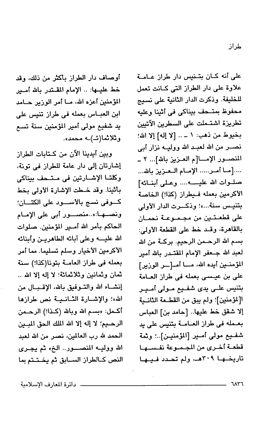 وبين أيدينا الآن من كتابات الطراز إشارتان إلى دار عامة للطراز فى تونة، وكلتا الإشارتين فى متحف بيناكى بأثينا. وقد خطت الإشارة الأولى بخط كوفى نسج بالأسود على الكتان؛ ونصها: ". . منصور أبى على الإمام الحاكم بأمر اللَّه أمير المؤمنين. صلوات اللَّه عليه وعلى آبائه الطاهرين وأبنائه الأكرمين الأخيار وسلم تسليمًا. مما أمر بعمله فى طراز العامة بتونا (كذا! ) سنة ثمان وثمانين وثلاثمائة؛ لا إله إلا اللَّه. . إنشاء اللَّه والتوفيق باللَّه، الإقبال من اللَّه"؛ والإشارة الثانية نص طرازها أكمل: "بسم اللَّه وباللَّه (كذا! ) الرحمن الرحيم؛ لا إله إلا اللَّه الملك الحق المبين الحمد للَّه رب العالمين، نصر من اللَّه لعبد اللَّه ووليه المنصور. . . الخ" ثم يجرى النص كالطراز السابق ثم يختتم بما