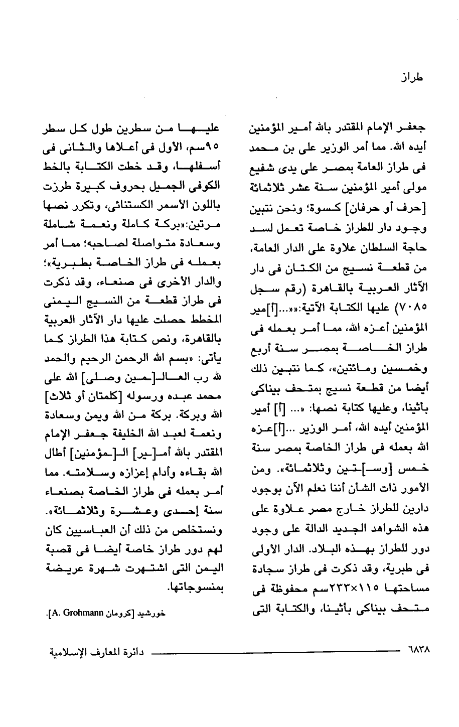 جعفر الإمام المقتدر باللَّه أمير المؤمنين أيده اللَّه. مما أمر الوزير على بن محمد فى طراز العامة بمصر على يدى شفيع مولى أمير المؤمنين سنة عشر ثلاثمائة [حرف أو حرفان] كسوة؛ ونحن نتبين وجود دار للطراز خاصة تعمل لسد حاجة السلطان علاوة على الدار العامة، من قطعة نسيج من الكتان فى دار الآثار العربية بالقاهرة (رقم سجل 7085) عليها الكتابة الآتية: "". . . [أ] مير المؤمنين أعزه اللَّه، مما أمر بعمله فى طراز الخاصة بمصر سنة أربع وخمسين ومائتين"، كما نتبين ذلك أيضًا من قطعة نسيج بمتحف بيناكى بأثينا، وعليها كتابة نصها: ". . . [أ] أمير المؤمنين أيده اللَّه، أمر الوزير. . . [أ] عزه اللَّه بعمله فى طراز الخاصة بمصر سنة خامس [وسـ]ــــتين وثلاثمائة". ومن الأمور ذات الشأن أننا نعلم الآن بوجود دارين للطراز خارج مصر علاوة على هذه الشواهد الجديد الدالة على وجود دور للطراز بهذه البلاد. الدار الأولى فى طبرية، وقد ذكرت فى طراز سجادة مساحتها 15 × 233 سم محفوظة فى متحف بيناكى بأثينا، والكتابة التى عليها من سطرين طول كل سطر 95 سم، الأول فى أعالاها والثانى فى أسفلها، وقد خطت الكتابة بالخط الكوفى الجميل بحروف كبيرة طرزت باللون الأسمر الكستنائى، وتكرر نصها مرتين: "بركة كاملة ونعمة شاملة وسعادة متواصلة لصاحبه؛ مما أمر بعمله فى طراز الخاصة بطبرية"؛ والدار الأخرى فى صنعاء، وقد ذكرت فى طراز قطعاة من النسيج اليمنى المخطط حصلت عليها دار الآثار العربية بالقاهرة، ونص كتابة هذا الطراز كما يأتى: "بسم اللَّه الرحمن الرحيم والحمد للَّه رب العالـ[ــــمين وصلى] اللَّه على محمد عبده ورسوله [كلمتان أو ثلاث] اللَّه وبركة. بركة من اللَّه ويمن وسعادة ونعمة لعبد اللَّه الخليفة جعفر الإمام المقتدر باللَّه أمـ[ـــــــير] المـ[ـــــــؤمنين] أطال اللَّه بقاءه وأدام إعزازه وسلامته. مما أمر بعمله فى طراز الخاصة بصنعاء سنة إحدى وعشرة وثلاثمائة". ونستخلص من ذلك أن العباسيين كان لهم دور طراز خاصة أيضًا فى قصبة اليمن التى اشتهرت شهرة عريضة بمنسوجاتها.