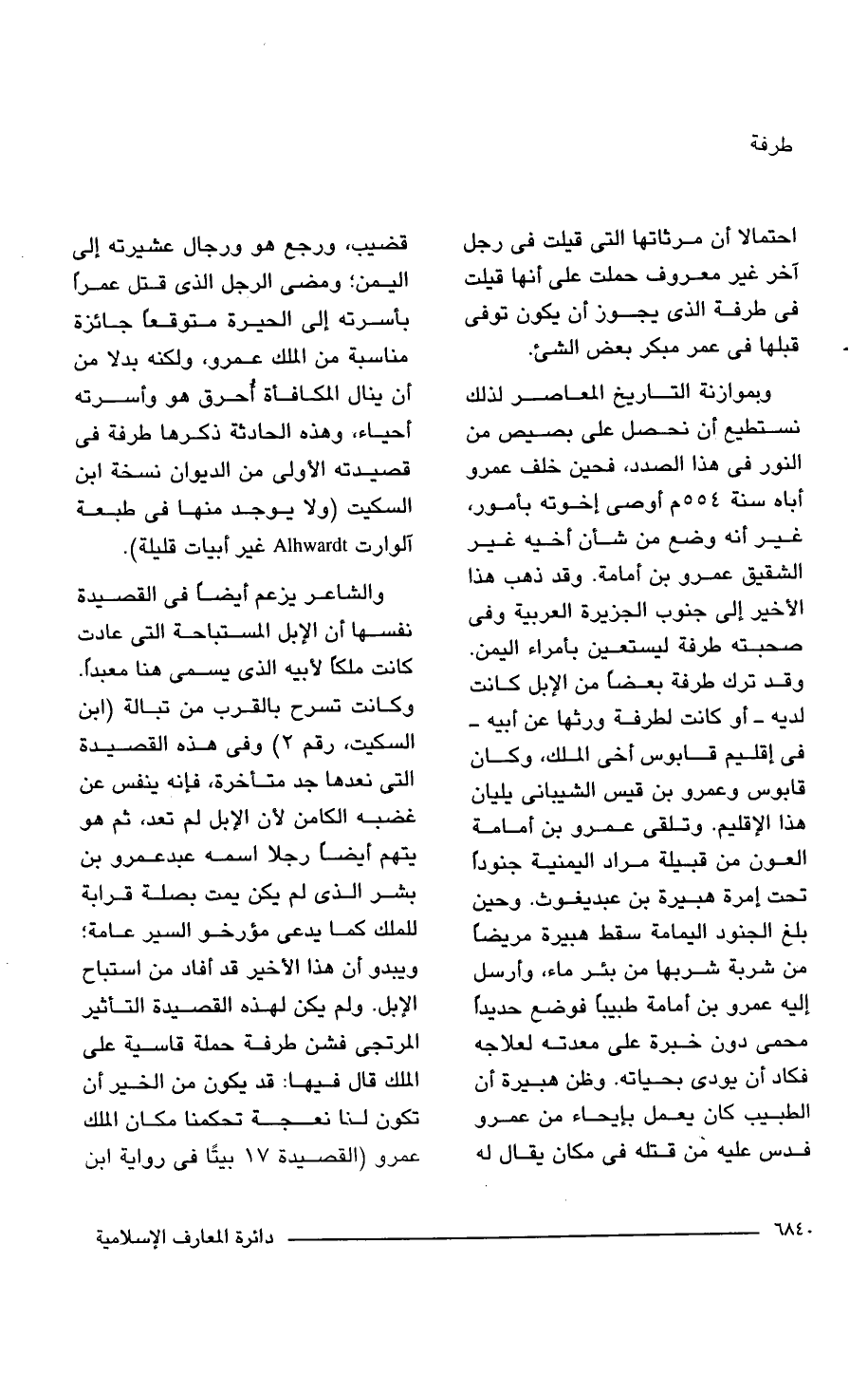 والشاعر يزعم أيضًا فى القصيدة نفسها أن الإبل المستباحة التى عادت كانت ملكًا لأبيه الذى يسمى هنا معبدًا. وكانت تسرح بالقرب من تبالة (ابن السكيت، رقم 2) وفى هذه القصيدة التى نعدها جد متأخرة، فإنه ينفس عن غضبه الكامن لأن الأبل لم تعد، ثم هو يتهم أيضًا رجلًا اسمه عبد عمرو بن بشر الذى لم يكن يمت بصلة قرابة للملك كما يدعى مؤرخو السير عامة؛ ويبدو أن هذا الأخير قد أفاد من استباح الإبل. ولم يكن لهذه القصيدة التأثير المرتجى فشن طرفة حملة قاسية على الملك قال فيها: قد يكون من الخير أن تكون لىنا نعجة تحكمنا مكان الملك عمرو (القصيدة 17 بيتًا فى رواية ابن