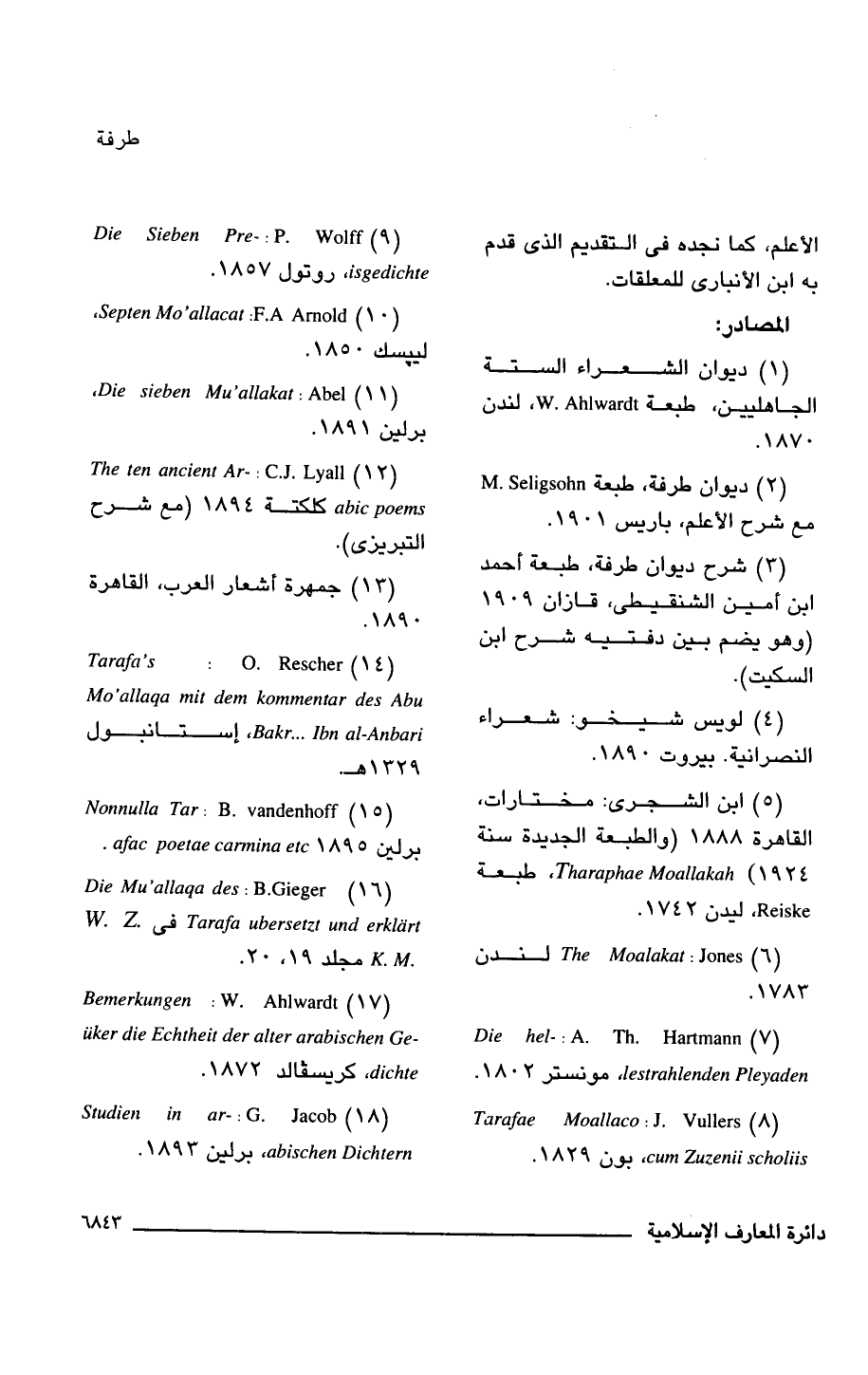 (16) Die Mu'allaqa des Tarafa ubersetzt und erklart: B.Gieger فى W.Z.K.M مجلد 19، 20.
