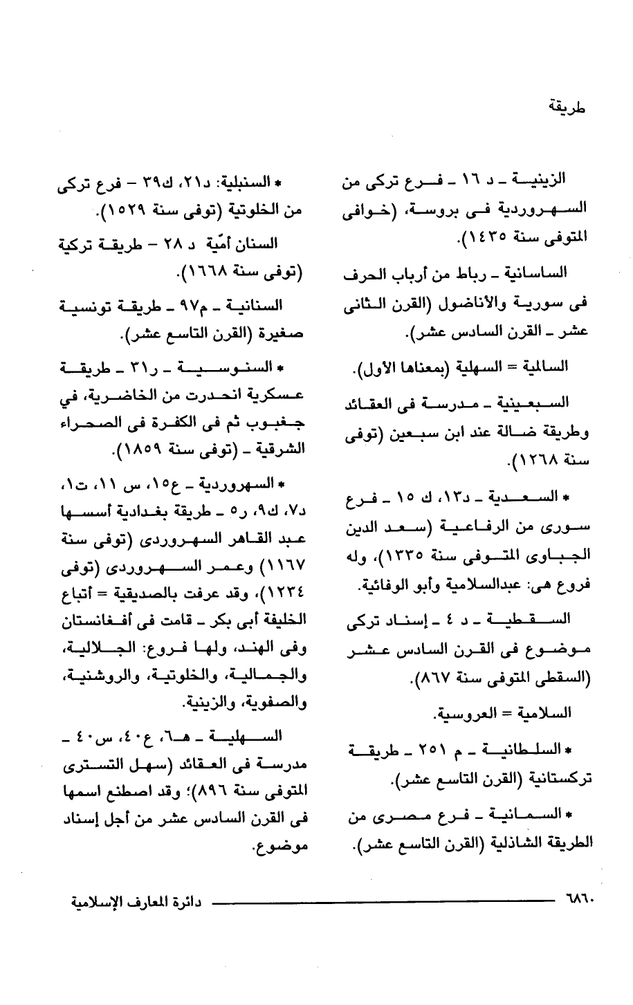 * السهروردية -ع 15، س 11، ت 1، د 7، ك 9، ر 5 - طريقة بغدادية أسسها عبد القاهر السهروردى (توفى سنة 1167) وعمر السهروردى (توفى 1234)، وقد عرفت بالصديقية = أتباع الخليفة أبى بكر- قامت فى أفغانستان وفى الهند، ولها فروع: الجلالية، والجمالية، والخلوتية، والروشنية، والصفوية، والزينية.