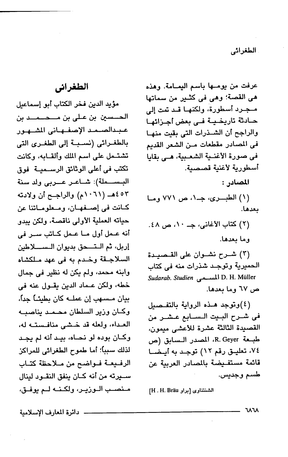 مؤيد الدين فخر الكتاب أبو إسماعيل الحسين بن على بن محمد بن عبد الصمد الأصفهانى المشهور بالطغرائى (نسبة إلى الطغرى التى تشتمل على اسم الملك وألقابه، وكانت تكتب فى أعلى الوثائق الرسمية فوق البسملة): شاعر عربى ولد سنة 453 هـ (1061 م) الراجح أن ولادته كانت فى إصفهان، ومعلوماتنا عن حياته العملية الأولى ناقصة، ولكن يبدو أنه عمل أول ما عمل كاتب سر فى إربل، ثم التحق بديوان السلاطين السلاجقة وخدم به فى عهد ملكشاه وابنه محمد، ولم يكن له نظير فى جمال خطه، ولكن عماد الدين يقول عنه فى بيان مسهب إن عمله كان بطيئًا جدًا، وكان وزير السلطان محمد يناصبه العداء، ولعله قد خشى منافسته له، وكان بوده لو نحاه، جيد أنه لم يجد لذلك سببًا؛ أما طموح الطغرائى للمراكز الرفيعة فواضح من ملاحظة كتاب سيرته من أنه كان ينفق النقود لينال منصب الوزير، ولكنه لم يوفق،