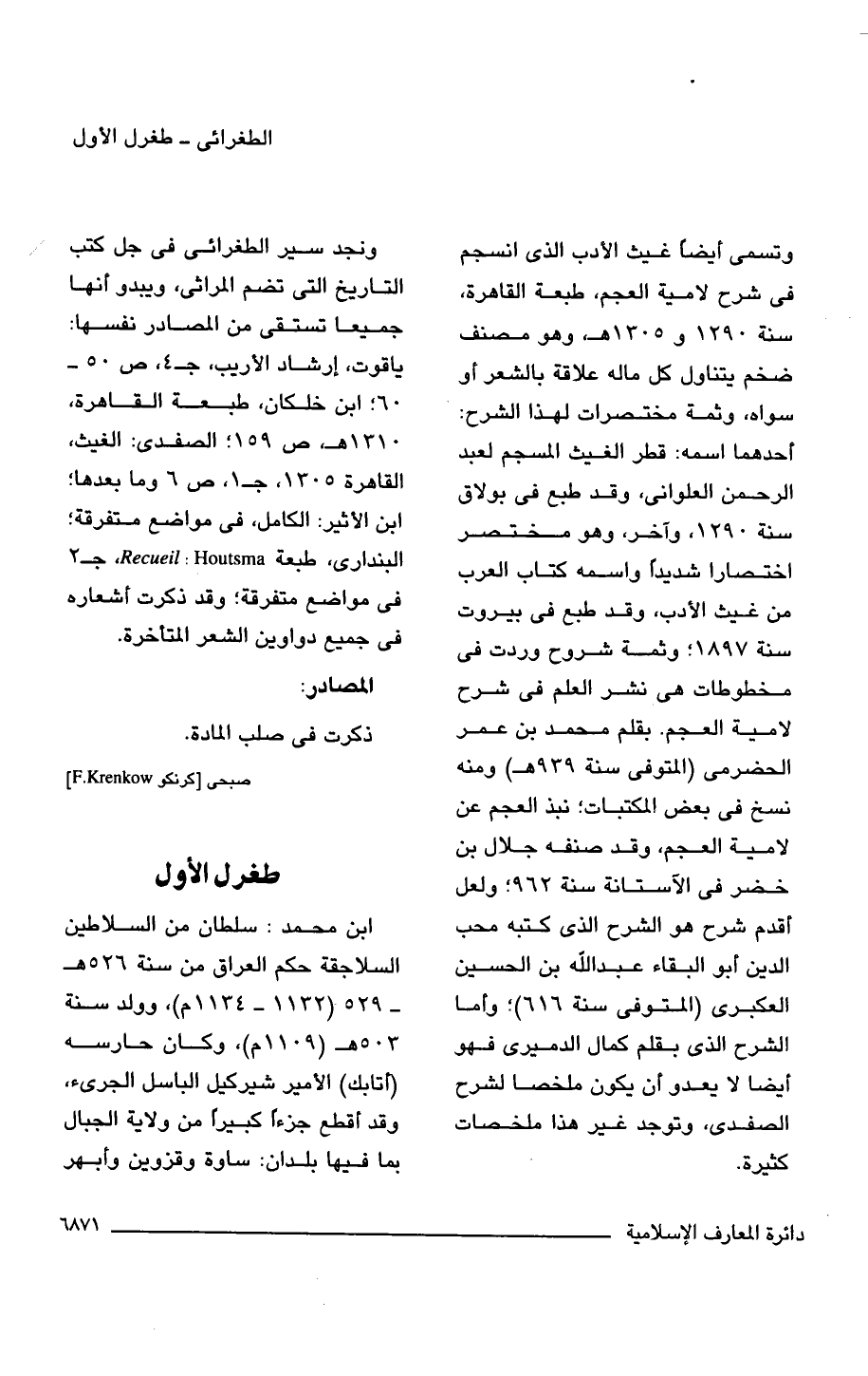 ونجد سير الطغرائى فى جل كتب التاريخ التى تضم المراثى، ويبدو أنها جميعا تستقى من المصادر نفسها: ياقوت، إرشاد الأريب، جـ 4، ص 50 - 60؛ ابن خلكان، طبعة القاهرة، 1310 هـ، ص 159؛ الصفدى: الغيث، القاهرة 1305، جـ 1، ص 6 وما بعدها؛ ابن الأثير: الكامل، فى مواضع متفرقة؛ البندارى، طبعة Recueil: Houtsma، جـ 2 فى مواضع متفرقة؛ وقد ذكرت أشعاره فى جميع دواوين الشعر المتأخرة.