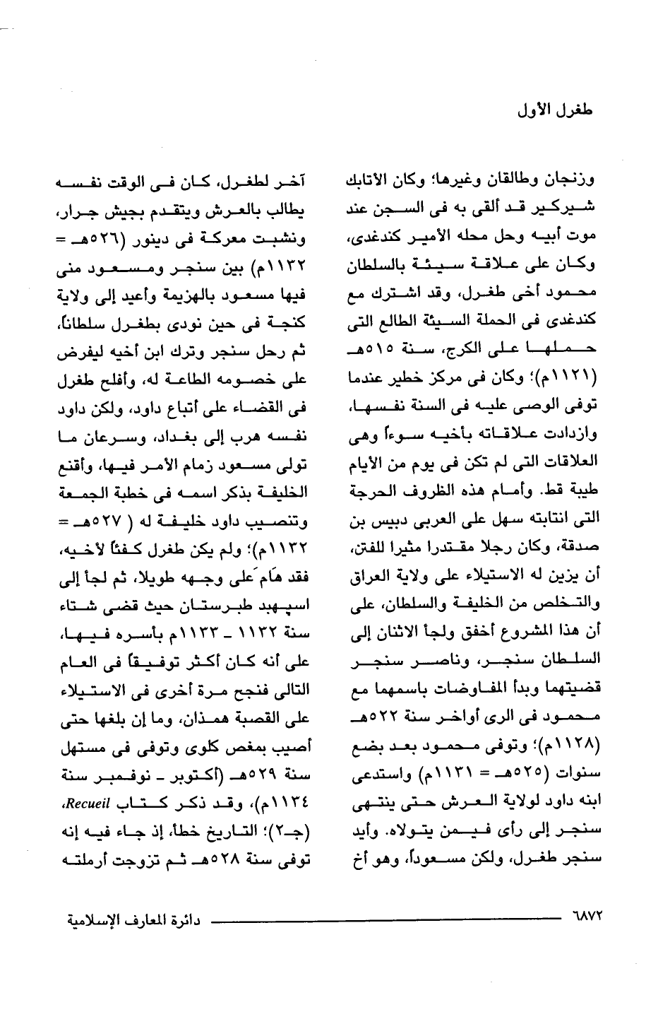 وزنجان وطالقان وغيرها؛ وكان الأتابك شيركير قد ألقى به فى السجن عند موت أبيه وحل محله الأمير كندغدى، وكان على علاقة سيئة بالسلطان محمود أخى طغرل، وقد اشترك مع كندغدى فى الحملة السيئة الطالع التى حملها على الكرج، سنة 515 هـ (1121 م)؛ وكان فى مركز خطير عندما توفى الوصى عليه فى السنة نفسها، وازدادت علاقاته بأخيه سوءًا وهى العلاقات التى لم تكن فى يوم من الأيام طيبة قط. وأمام هذه الظروف الحرجة التى انتابته سهل على العربى دبيس بن صدقة، وكان رجلًا مقتدرًا مثيرًا للفتن، أن يزين له الاستيلاء على ولاية العراق والتخلص من الخليفة والسلطان، على أن هذا المشروع أخفق ولجأ الاثنان إلى السلطان سنجر، وناصر سنجر قضيتهما وبدأ المفاوضات باسمهما مع محمود فى الرى أواخر سنة 522 هـ (1128 م)؛ وتوفى محمود بعد بضع سنوات (525 هـ = 1131 م) واستدعى ابنه داود لولاية العرش حتى ينتهى سنجر إلى رأى فيمن يتولاه. وأيد سنجر طغرل، ولكن مسعودًا، وهو أخ آخر لطغرل، كان فى الوقت نفسه يطالب بالعرش ويتقدم بجيش جرار، ونشبت معركة فى دينور (526 هـ = 1132 م) بين سنجر ومسعود منى فيها مسعود بالهزيمة وأعيد إلى ولاية كنجة فى حين نودى بطغرل سلطانًا، ثم رحل سنجر وترك ابن أخيه ليفرض على خصومه الطاعة له، وأفلح طغرل فى القضاء على أتباع داود، ولكن داود نفسه هرب إلى بغداد، وسرعان ما تولى مسعود زمام الأمر فيها، وأقنع الخليفة بذكر اسمه فى خطبة الجمعة وتنصيب داود خليفة له (527 هـ = 1132 م)؛ ولم يكن طغرل كفئًا لأخيه، فقد هَامَ على وجهه طويلًا، ثم لجأ إلى اسيهبد طبرستان حيث قضى شتاء سنة 1132 - 1133 م بأسره فيها، على أنه كان أكثر توفيقًا فى العام التالى فنجح مرة أخرى فى الاستيلاء على القصبة همذان، وما إن بلغها حتى أصيب بمغص كلوى وتوفى فى مستهل سنة 529 هـ (أكتوبر - نوفمبر سنة 1134 م)، وقد ذكر كتاب Recueil (جـ 2)؛ التاريخ خطأ، إذ جاء فيه إنه توفى سنة 528 هـ ثم تزوجت أرملته