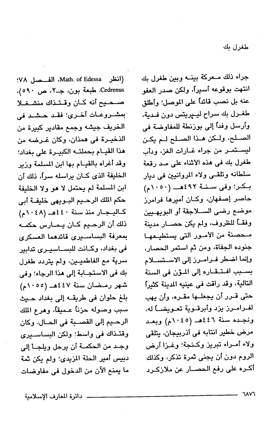 جراء ذلك معركة بينه وبين طغرل بك انتهت بوقوعه أسيرًا، ولكن صدر العفو عنه بل نصب قائدًا على الموصل؛ وأطلق طغرل بك سراح ليبريتس دون فدية، وأرسل وفدًا إلى بوزنطة للمفاوضة فى الصلح، ولكن هذا الصلح لم يكن ليستمر من جراء غارات الغز، ودأب طغرل بك فى هذه الأثناء على مد رقعة سلطانه وتلقى ولاء المروانيين فى ديار بكر؛ وفى سنة 492 هـ (1050 م) حاصر إصفهان، وكان أميرها فرامرز موضع رضى السلاجقة أو البويهيين وفقًا للظروف، ولم يكن حصار مدينة محصنة من الأمور التى يستطيعها جنوده الجفاة، ومن ثم استمر الحصار، وإنما اضطر فرامرز إلى الاستسلام بسبب افتقاره إلى المؤن فى السنة التالية، وقد راقت فى عينيه المدينة كثيرًا حتى قرر أن يجعلها مقره، وأن يهب لفرامرز يزد وأبرقوية تعويضًا له، ونجده سنة 446 هـ (1045 م) وبعد مرض خطير انتابه فى آذربيجان، يتلقى ولاء أمراء تبريز وكنجة؛ وغزا أرض الروم دون أن يجنى ثمرة تذكر، وكذلك أكره على رفع الحصار عن ملازكرد (انظر Math. of Edessa، الفصل 78؛ Cedrenus، طبعة بون، جـ 2، ص 590)، صحيح أنه كان وقتذاك منشغلا بمشروعات أخرى؛ فقد حشد فى الخريف جيشه وجمع مقادير كبيرة من الذخيرة فى همذان، وكان غرضه من هذا القيام بحملته الكبيرة على بغداد؛ وقد أغراه بالقيام بها ابن المسلمة وزير الخليفة الذى كان يراسله سرًا، ذلك أن ابن المسلمة لم يحتمل لا هو ولا الخليفة حكم الملك الرحيم البويهى خليفة أبى كاليجار منذ سنة 440 هـ (1048 م) ذلك أن الرحيم كان يمارس حكمه بمعرفة البساسيرى قائدهما العسكرى فى بغداد، وكانت للبساسيرى تدابير سرية مع الفاطميين، ولم يتردد طغرل بك فى الاستجابة إلى هذا الرجاء؛ وفى شهر رمضان سنة 447 هـ (1055 م) بلغ حلوان فى طريقه إلى بغداد حيث سبب وصوله حزنًا عميقًا، وهرع الملك الرحيم إلى القصبة فى الحال، وكان وقتذاك فى واسط؛ ولكن البساسيرى وجد من الحكمة أن يرحل ويلجأ إلى دبيس أمير الحلة المزيدى؛ ولم يكن ثمة ما يمنع الآن من الدخول فى مفاوضات