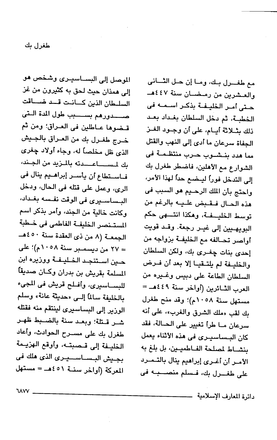 مع طغرل بك، وما إن حل الثانى والعشرين من رمضان سنة 447 هـ حتى أمر الخليفة بذكر اسمه فى الخطبة، ثم دخل السلطان بغداد بعد ذلك بثلاثة أيام، على أن وجود الغز الجفاة سرعان ما أدى إلى النهب والقتل مما هدد بنشوب حرب منتظمة فى الشوارع مع الأهلين، فاضطر طغرل بك إلى التدخل فورًا ليضع حدًا لهذا الأمر، واحتج بأن الملك الرحيم هو السبب فى هذه الحال فقبض عليه بالرغم من توسط الخليفة، وهكذا انتهى حكم البويهيين إلى غير رجعة. وقد قويت أواصر تحالفه مع الخليفة بزواجه من إحدى بنات جغرى بك، ولكن السلطان والخليفة لم يلتقيط إلا بعد أن فرض السلطان الطاعة على دبيس وغيره من العرب الثائرين (أواخر سنة 449 هـ = مستهل سنة 1058 م)؛ وقد منح طغرل بك لقب "ملك الشرق والغرب"، على أنه سرعان ما طرأ تغيير على الحالة، فقد كان البساسيرى فى هذه الأثناء يعمل بنشاط لمصلحة الفاطميين، بل بلغ به الأمر أن أغرى إبراهيم ينال بالتمرد على طغرل بك، فسلم منصبه فى الموصل إلى البساسيرى وشخص هو إلى همذان حيث لحق به كثيرون من غز السلطان الذين كانت قد ضاقت صدورهم بسبب طول المدة التى قضوها عاطلين فى العراق؛ ومن ثم خرج طغرل بك من العراق بالجيش الذى ظل مخلصًا له، وجاء أولاد جغرى بك لمساعدته بالمزيد من الجند، فاستطاع أن يأسر إبراهيم ينال فى الرى، وعمل على قتله فى الحال، ودخل البساسيرى فى الوقت نفسه بغداد، وكانت خالية من الجند، وأمر بذكر اسم المستنصر الخليفة الفاطمى فى خطبة الجمعة (8 من ذى العقدة سنة 450 هـ = 27 من ديسمبر سنة 1058 م)؛ على حين استنجد الخليفة ووزيره ابن المسلمة بقريش بن بدران وكان صديقًا للبساسيرى، وأفلح قريش فى المجئ بالخليفة سالمًا إلى "حديثة عانة" وسلم الوزير إلى البساسيرى لينتقم منه فقتله شر قتلة؛ وبعد سنة بالضبط ظهر طغرل بك على مسرح الحوادث، وأعاد الخليفة إلى قصبته، وأوقع الهزيمة بجيش البساسيرى الذى هلك فى المعركة (أواخر سنة 451 هـ = مستهل