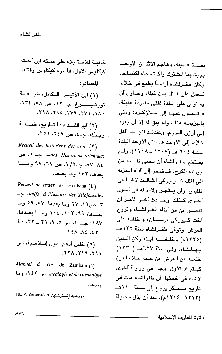 (4) Recueil de textes relatife a l'histoire des Seloioucide: Houtsma، جـ 3، ص 11، 27 وما بعدها، 57، 59 وما بعدها، 99، 102، 104 وما بعدها، 187؛ جـ 4، ص 5، 9، 21 - 33، 40 - 43، 84، 148.