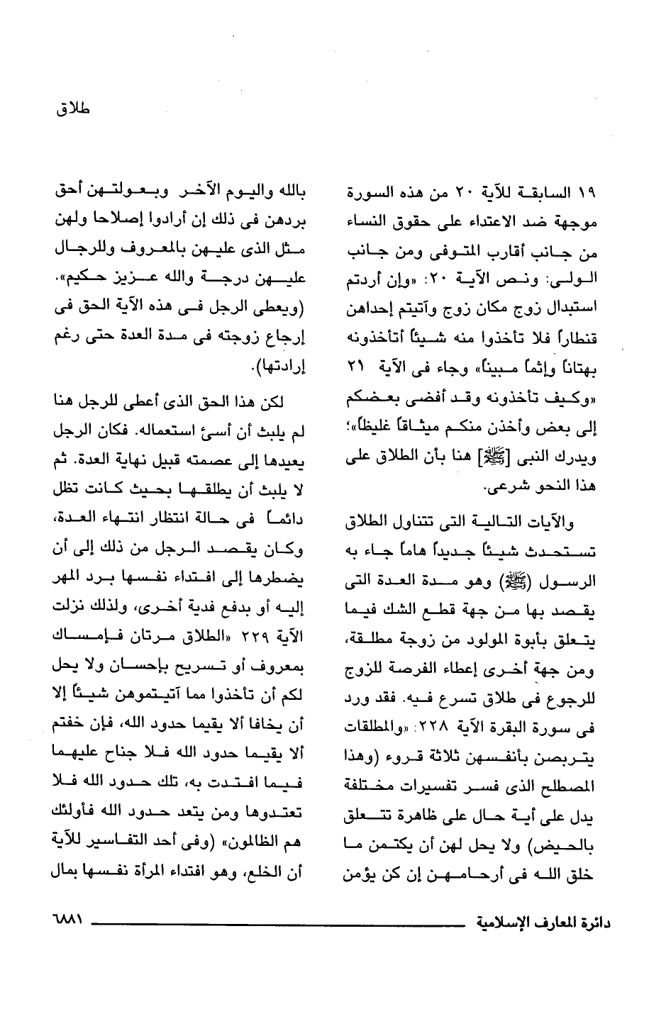 19 السابقة للآية 20 من هذه السورة موجهة ضد الاعتداء على حقوق النساء من جانب أقارب المتوفى ومن جانب الولى: ونص الآية 20: {وَإِنْ أَرَدْتُمُ اسْتِبْدَالَ زَوْجٍ مَكَانَ زَوْجٍ وَآتَيْتُمْ إِحْدَاهُنَّ قِنْطَارًا فَلَا تَأْخُذُوا مِنْهُ شَيْئًا أَتَأْخُذُونَهُ بُهْتَانًا وَإِثْمًا مُبِينًا} وجاء فى الآية 21 {وَكَيْفَ تَأْخُذُونَهُ وَقَدْ أَفْضَى بَعْضُكُمْ إِلَى بَعْضٍ وَأَخَذْنَ مِنْكُمْ مِيثَاقًا غَلِيظًا} ويدرك النبى [-صلى اللَّه عليه وسلم-] هنا بأن الطلاق على هذا النحو شرعى.
