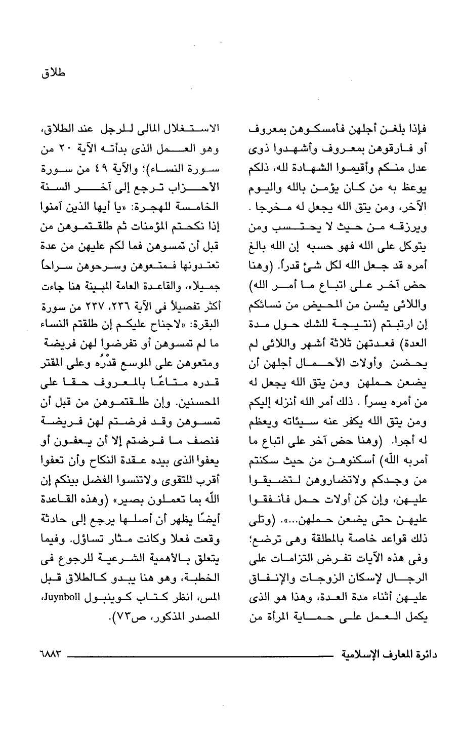 {فَإِذَا بَلَغْنَ أَجَلَهُنَّ فَأَمْسِكُوهُنَّ بِمَعْرُوفٍ أَوْ فَارِقُوهُنَّ بِمَعْرُوفٍ وَأَشْهِدُوا ذَوَيْ عَدْلٍ مِنْكُمْ وَأَقِيمُوا الشَّهَادَةَ لِلَّهِ ذَلِكُمْ يُوعَظُ بِهِ مَنْ كَانَ يُؤْمِنُ بِاللَّهِ وَالْيَوْمِ الْآخِرِ وَمَنْ يَتَّقِ اللَّهَ يَجْعَلْ لَهُ مَخْرَجًا (2) وَيَرْزُقْهُ مِنْ حَيْثُ لَا يَحْتَسِبُ وَمَنْ يَتَوَكَّلْ عَلَى اللَّهِ فَهُوَ حَسْبُهُ إِنَّ اللَّهَ بَالِغُ أَمْرِهِ قَدْ جَعَلَ اللَّهُ لِكُلِّ شَيْءٍ قَدْرًا}. (وهنا حض آخر على اتباع ما أمر اللَّه) {وَاللَّائِي يَئِسْنَ مِنَ الْمَحِيضِ مِنْ نِسَائِكُمْ إِنِ ارْتَبْتُمْ} (نتيجة للشك حول مدة العدة) {فَعِدَّتُهُنَّ ثَلَاثَةُ أَشْهُرٍ وَاللَّائِي لَمْ يَحِضْنَ وَأُولَاتُ الْأَحْمَالِ أَجَلُهُنَّ أَنْ يَضَعْنَ حَمْلَهُنَّ وَمَنْ يَتَّقِ اللَّهَ يَجْعَلْ لَهُ مِنْ أَمْرِهِ يُسْرًا (4) ذَلِكَ أَمْرُ اللَّهِ أَنْزَلَهُ إِلَيْكُمْ وَمَنْ يَتَّقِ اللَّهَ يُكَفِّرْ عَنْهُ سَيِّئَاتِهِ وَيُعْظِمْ لَهُ أَجْرًا}. (وهنا حض آخر على اتباع ما أمربه اللَّه) {أَسْكِنُوهُنَّ مِنْ حَيْثُ سَكَنْتُمْ مِنْ وُجْدِكُمْ وَلَا تُضَارُّوهُنَّ لِتُضَيِّقُوا عَلَيْهِنَّ وَإِنْ كُنَّ أُولَاتِ حَمْلٍ فَأَنْفِقُوا عَلَيْهِنَّ حَتَّى يَضَعْنَ حَمْلَهُنَّ. . .}. (وتلى ذلك قواعد خاصة بالمطلقة وهى ترضع؛ وفى هذه الآيات تفرض التزامات على الرجال لإسكان الزوجات والإنفاق عليهن أثناء مدة العدة، وهذا هو الذى يكمل العمل على حماية المرأة من الاستغلال المالى للرجل عند الطلاق، وهو العمل الذى بدأته الآية 20 من سورة النساء)؛ والآية 49 من سورة الأحزاب ترجع إلى آخر السنة الخامسة للهجرة: {يَاأَيُّهَا الَّذِينَ آمَنُوا إِذَا نَكَحْتُمُ الْمُؤْمِنَاتِ ثُمَّ طَلَّقْتُمُوهُنَّ مِنْ قَبْلِ أَنْ تَمَسُّوهُنَّ فَمَا لَكُمْ عَلَيْهِنَّ مِنْ عِدَّةٍ تَعْتَدُّونَهَا فَمَتِّعُوهُنَّ وَسَرِّحُوهُنَّ سَرَاحًا جَمِيلًا}، والقاعدة العامة المبينة هنا جاءت أكثر تفصيلًا فى الآية 236، 237 من سورة البقرة: {لَا جُنَاحَ عَلَيْكُمْ إِنْ طَلَّقْتُمُ النِّسَاءَ مَا لَمْ تَمَسُّوهُنَّ أَوْ تَفْرِضُوا لَهُنَّ فَرِيضَةً وَمَتِّعُوهُنَّ عَلَى الْمُوسِعِ قَدَرُهُ وَعَلَى الْمُقْتِرِ قَدَرُهُ مَتَاعًا بِالْمَعْرُوفِ حَقًّا عَلَى الْمُحْسِنِينَ (236) وَإِنْ طَلَّقْتُمُوهُنَّ مِنْ قَبْلِ أَنْ تَمَسُّوهُنَّ وَقَدْ فَرَضْتُمْ لَهُنَّ فَرِيضَةً فَنِصْفُ مَا فَرَضْتُمْ إِلَّا أَنْ يَعْفُونَ أَوْ يَعْفُوَ الَّذِي بِيَدِهِ عُقْدَةُ النِّكَاحِ وَأَنْ تَعْفُوا أَقْرَبُ لِلتَّقْوَى وَلَا تَنْسَوُا الْفَضْلَ بَيْنَكُمْ إِنَّ اللَّهَ بِمَا تَعْمَلُونَ بَصِيرٌ} (وهذه القاعدة أيضًا يظهر أن أصلها يرجع إلى حادثة وقعت فعلا وكانت مثار تساؤل. وفيما يتعلق بالأهمية الشرعية للرجوع فى الخطبة، وهو هنا يبدو كالطلاق قبل المس، انظر كتاب كوينبول Juynboll، المصدر المذكور، ص 73).