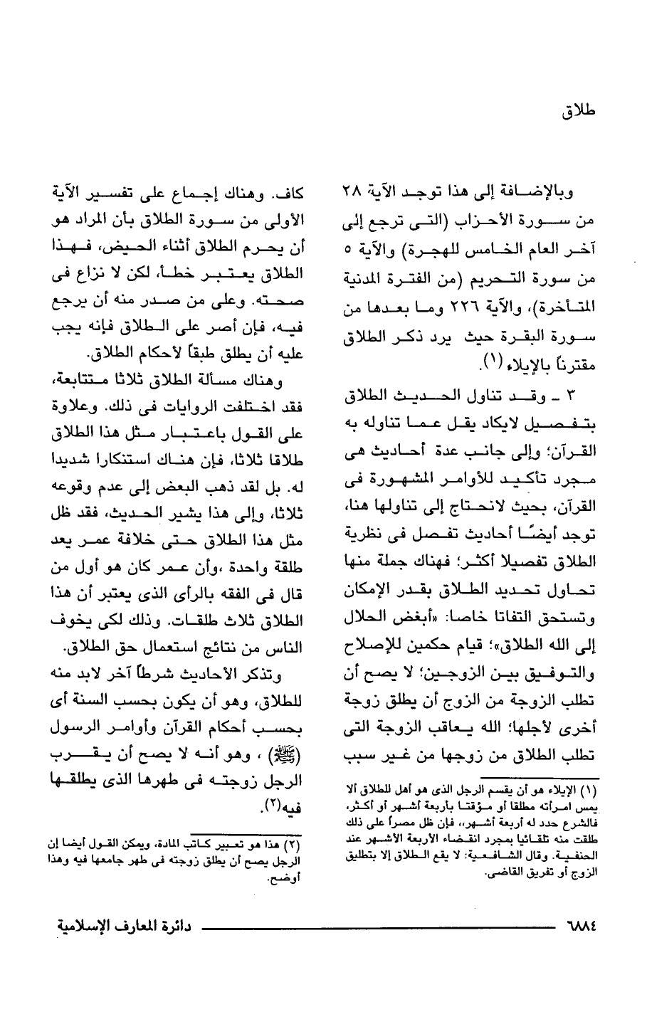3 - وقد تناول الحديث الطلاق بتفصيل لا يكاد يقل عما تناوله به القرآن؛ وإلى جانب عدة أحاديث هى مجرد تأكيد للأوامر المشهورة فى القرآن، بحيث لا نحتاج إلى تناولها هنا، توجد أيضًا أحاديث تفصل فى نظرية الطلاق تفصيلًا أكثر؛ فهناك جملة منها تحاول تحديد الطلاق بقدر الإمكان وتستحق التفاتًا خاصًا: "أبغض الحلال إلى اللَّه الطلاق"؛ قيام حكمين للإصلاح والتوفيق بين الزوجين؛ لا يصح أن تطلب الزوجة من الزوج أن يطلق زوجة أخرى لأجلها؛ اللَّه يعاقب الزوجة التى تطلب الطلاق من زوجها من غير سبب كاف. وهناك إجماع على تفسير الآية الأولى من سورة الطلاق بأن المراد هو أن يحرم الطلاق أثناء الحيض، فهذا الطلاق يعتبر خطأ، لكن لا نزاع فى صحته. وعلى من صدر منه أن يرجع فيه، فإن أصر على الطلاق فإنه يجب عليه أن يطلق طبقًا لأحكام الطلاق.