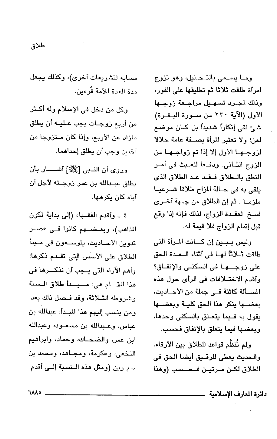 4 - وأقدم الفقهاء (إلى بداية تكون المذاهب)، وبعضهم كانوا فى عصر تدوين الأحاديث، يتوسعون فى مبدأ الطلاق على الأسس التى تقدم ذكرها؛ وأهم الآراء التى يجب أن نذكرها فى هذا المقام هى: مبدأ طلاق السنة وشروطه الثلاثة، وقد فصل ذلك بعد. ومن ينسب إليهم هذا المبدأ: عبد اللَّه بن عباس، وعبد اللَّه بن مسعود، وعبد اللَّه ابن عمر، والضحاك، وحماد، وإبراهيم النخعى، وعكرمة، ومجاهد، ومحمد بن سيرين (ومثل هذه النسبة إلى أقدم