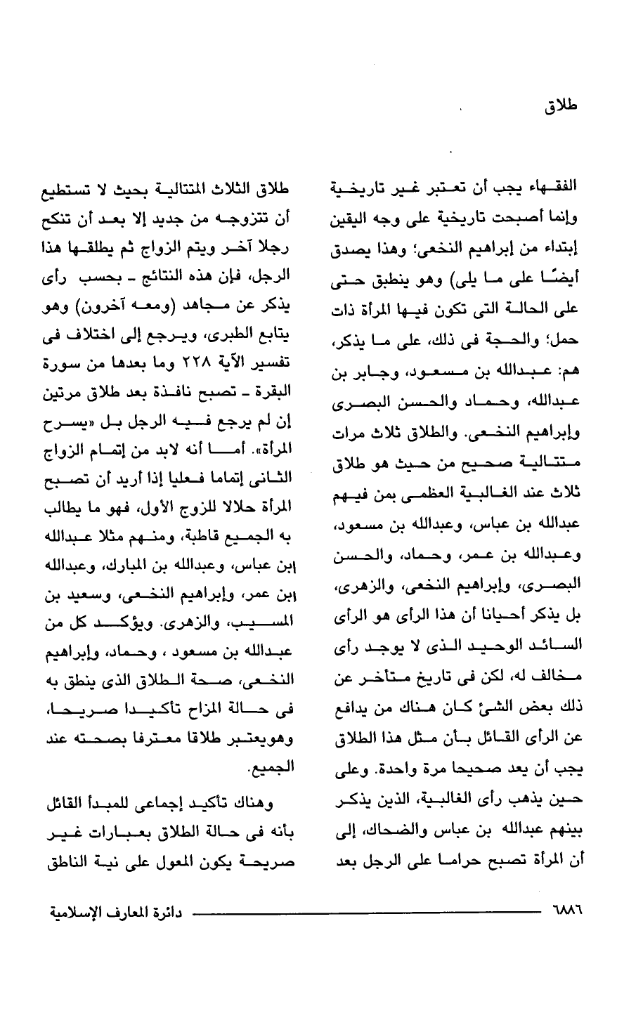 الفقهاء يجب أن تعتبر غير تاريخية وإنما أصبحت تاريخية على وجه اليقين إبتداء من إبراهيم النخعى؛ وهذا يصدق أيضًا على ما يلى) وهو ينطبق حتى على الحالة التى تكون فيها المرأة ذات حمل؛ والحجة فى ذلك، على ما يذكر، هم: عبد اللَّه بن مسعود، وجابر بن عبد اللَّه، وحماد والحسن البصرى وإبراهيم النخعى. والطلاق ثلاث مرات متتالية صحيح من حيث هو طلاق ثلاث عند الغالبية العظمى بمن فيهم عبد اللَّه بن عباس، وعبد اللَّه بن مسعود، وعبد اللَّه بن عمر، وحماد، والحسن البصرى، وإبراهيم النخعى، والزهوى، بل يذكر أحيانًا أن هذا الرأى هو الرأى السائد الوحيد الذى لا يوجد رأى مخالف له، لكن فى تاريخ متأخر عن ذلك بعض الشئ كان هناك من يدافع عن الرأى القائل بأن مثل هذا الطلاق يجب أن يعد صحيحًا مرة واحدة. وعلى حين يذهب رأى الغالبية، الذين يذكر بينهم عبد اللَّه بن عباس والضحاك، إلى أن المرأة تصبح حرامًا على الرجل بعد طلاق الثلاث المتتالية بحيث لا تستطيع أن تتزوجه من جديد إلا بعد أن تنكح رجلا آخر ويتم الزواج ثم يطلقها هذا الرجل، فإن هذه النتائج -بحسب رأى يذكر عن مجاهد (ومعه آخرون) وهو يتابع الطبرى، ويرجع إلى اختلاف فى تفسير الآية 228 وما بعدها من سورة البقرة- تصبح نافذة بعد طلاق مرتين إن لم يرجع فيه الرجل بل "يسرح المرأة". أما أنه لابد من إتمام الزواج الثانى إتمامًا فعليًا إذا أريد أن تصبح المرأة حلالًا للزوج الأول، فهو ما يطالب به الجميع قاطبة، ومنهم مثلا عبد اللَّه ابن عباس، وعبد اللَّه بن المبارك، وعبد اللَّه ابن عمر، وإبراهيم النخعى، وسعيد بن المسيب، والزهرى. ويؤكد كل من عبد اللَّه بن مسعود، وحماد، وإبراهيم النخعى، صحة الطلاق الذى ينطق به فى حالة المزاح تأكيدًا صريحًا، وهو يعتبر طلاقًا معترفًا بصحته عند الجميع.