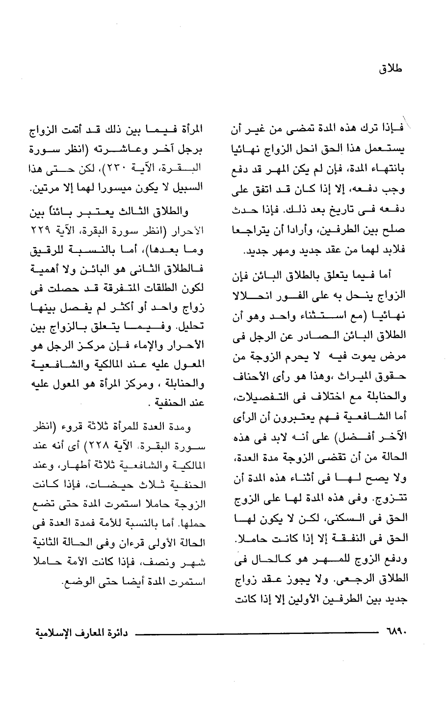 أما فيما يتعلق بالطلاق البائن فإن الزواج ينحل به على الفور انحلالا نهائيا (مع استثناء واحد وهو أن الطلاق البائن الصادر عن الرجل فى مرض يموت فيه لا يحرم الزوجة من حقوق الميراث، وهذا هو رأى الأحناف والحنابلة مع اختلاف فى التفصيلات، أما الشافعية فهم يعتبرون أن الرأى الآخر أفضل) على أنه لابد فى هذه الحالة من أن تقضى الزوجة مدة العدة، ولا يصح لها فى أثناء هذه المدة أن تتزوج. وفى هذه المدة لها على الزوج الحق فى السكنى، لكن لا يكون لها الحق فى النفقة إلا إذا كانت حاملا. ودفع الزوج للمهر هو كالحال فى الطلاق الرجعى. ولا يجوز عقد زواج جديد بين الطرفين الأولين إلا إذا كانت المرأة فيما بين ذلك قد أتمت الزواج برجل آخر وعاشرته (انظر سورة البقرة، الآية 230)، لكن حتى هذا السبيل لا يكون ميسورا لهما إلا مرتين.