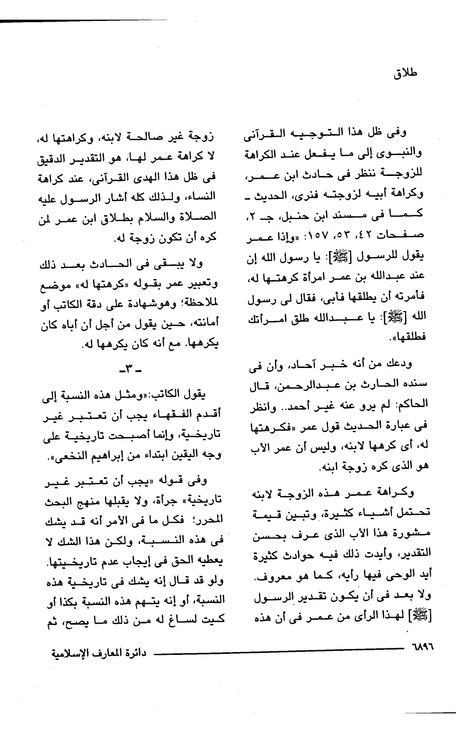 وفى ظل هذا التوجيه القرآنى والنبوى إلى ما يفعل عند الكراهة للزوجة ننظر فى حادث ابن عمر، وكراهة أبيه لزوجته فنرى، الحديث -كما فى مسند ابن حنبل، جـ 2، صفحات 42, 53, 157: "وإذا عمر يقول للرسول [-صلى اللَّه عليه وسلم-]: يا رسول اللَّه إن عند عبد اللَّه بن عمر امرأة كرهتها له، فأمرته أن يطلقها فأبى، فقال لى رسول اللَّه [-صلى اللَّه عليه وسلم-]: يا عبد اللَّه طلق امرأتك فطلقها".