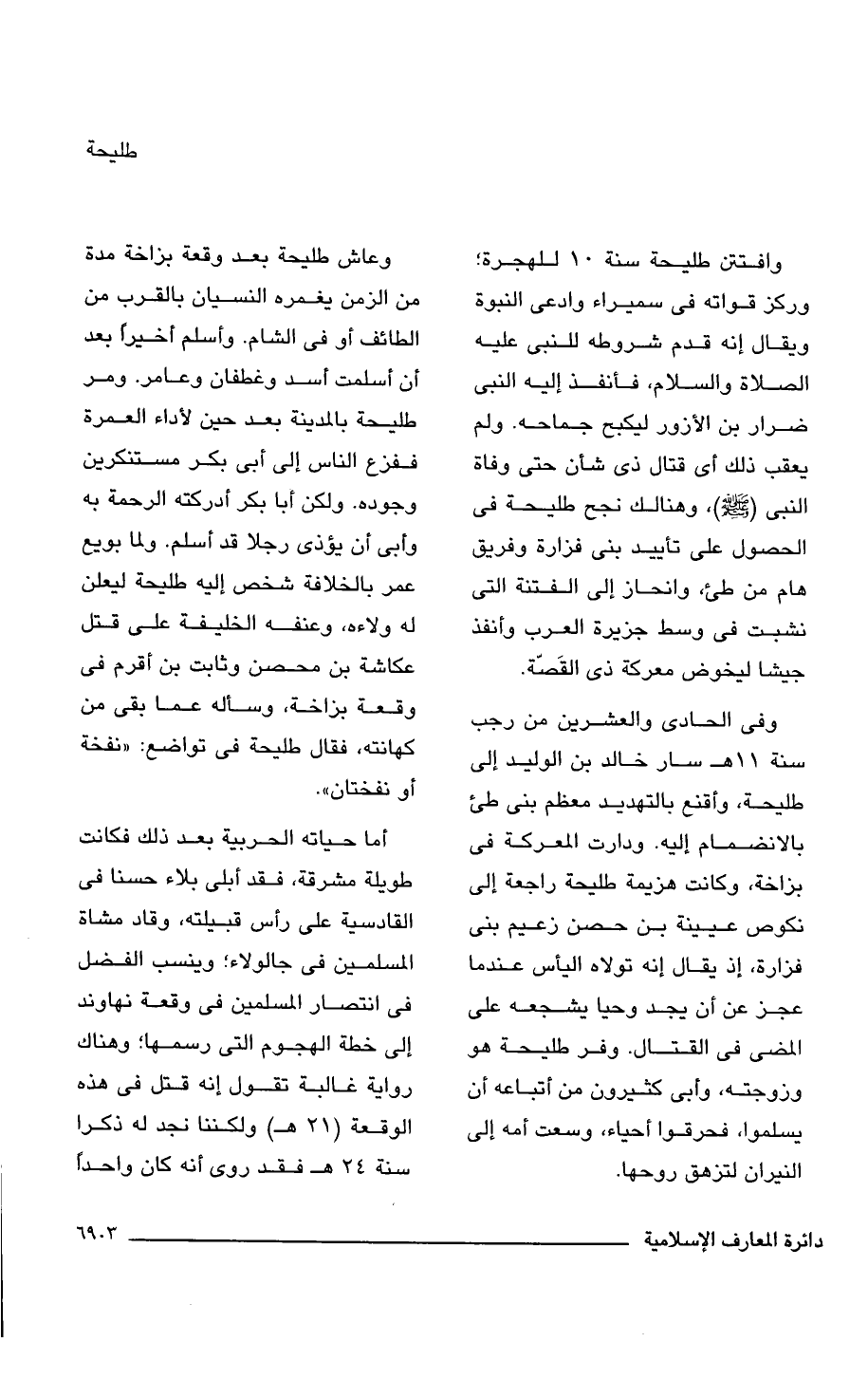 وفى الحادى والعشرين من رجب سنة 11 هـ سار خالد بن الوليد إلى طليحة، وأقنع بالتهديد معظم بنى طئ بالانضمام إليه. ودارت المعركة فى بزاخة، وكانت هزيمة طليحة راجعة إلى نكوص عيينة بن حصن زعيم بنى فزارة، إذ يقال إنه تولاه اليأس عندما عجز عن أن يجد وحيا يشجعه على المضى فى القتال. وفر طليحة هو وزوجته، وأبى كثيرون من أتباعه أن يسلموا، فحرقوا أحياء، وسعت أمه إلى النيران لتزهق روحها.