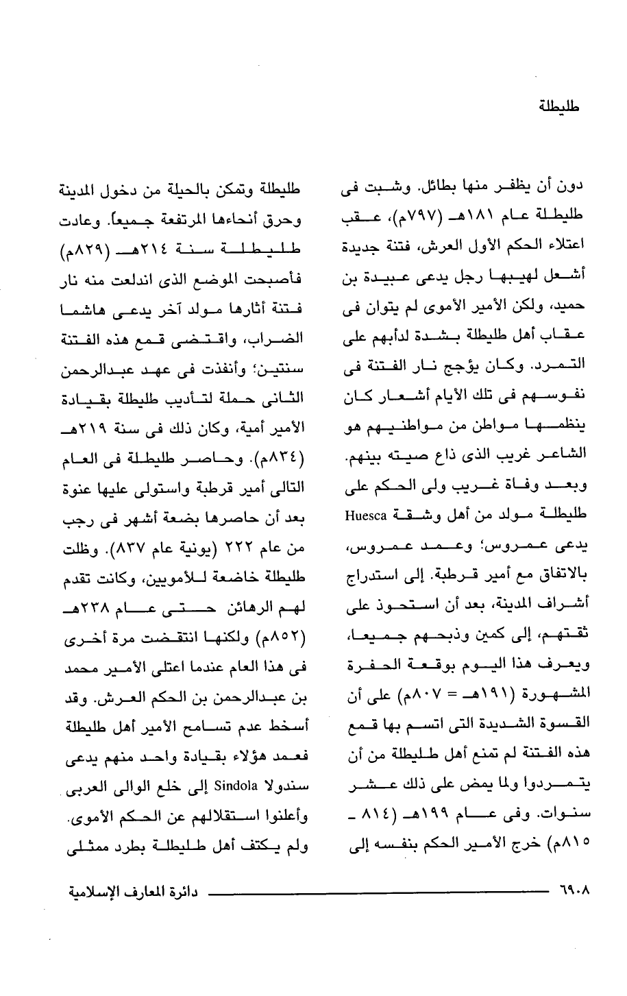 دون أن يظفر منها بطائل. وشبت فى طليطلة عام 181 هـ (797 م)، عقب اعتلاء الحكم الأول العرش، فتنة جديدة أشعل لهيبها رجل يدعى عبيدة بن حميد، ولكن الأمير الأموى لم يتوان فى عقاب أهل طليطلة بشدة لدأبهم على التمرد. وكان يؤجج نار الفتنة فى نفوسهم فى تلك الأيام أشعار كان ينظمها مواطن من مواطنيهم هو الشاعر غريب الذى ذاع صيته بينهم. وبعد وفاة غريب ولى الحكم على طليطلة مولد من أهل وشقة Huesca يدعى عمروس؛ وعمد عمروس، بالاتفاق مع أمير قرطبة. إلى استدراج أشراف المدينة، بعد أن استحوذ على ثقتهم، إلى كمين وذبحهم جميعا، ويعرف هذا اليوم بوقعة الحفرة المشهورة (191 هـ = 807 م) على أن القسوة الشديدة التى اتسم بها قمع هذه الفتنة لم تمنع أهل طليطلة من أن يتمردوا ولما يمض على ذلك عشر سنوات. وفى عام 199 هـ (814 - 815 م) خرج الأمير الحكم بنفسه إلى طليطلة وتمكن بالحيلة من دخول المدينة وحرق أنحاءها المرتفعة جميعا. وعادت طليطلة سنة 214 هـ (829 م) فأصبحت الموضع الذى اندلعت منه نار فتنة أثارها مولد آخر يدعى هاشما الضراب، واقتضى قمع هذه الفتنة سنتين؛ وأنفذت فى عهد عبد الرحمن الثانى حملة لتأديب طليطلة بقيادة الأمير أمية، وكان ذلك فى سنة 219 هـ (834 م). وحاصر طليطلة فى العام التالى أمير قرطبة واستولى عليها عنوة بعد أن حاصرها بضعة أشهر فى رجب من عام 222 (يونية عام 837). وظلت طليطلة خاضعة للأمويين، وكانت تقدم لهم الرهائن حتى عام 238 هـ (852 م) ولكنها انتقضت مرة أخرى فى هذا العام عندما اعتلى الأمير محمد بن عبد الرحمن بن الحكم العرش. وقد أسخط عدم تسامح الأمير أهل طليطلة فعمد هؤلاء بقيادة واحد منهم يدعى سندولا Sindola إلى خلع الوالى العربى وأعلنوا استقلالهم عن الحكم الأموى. ولم يكتف أهل طليطلة بطرد ممثلى