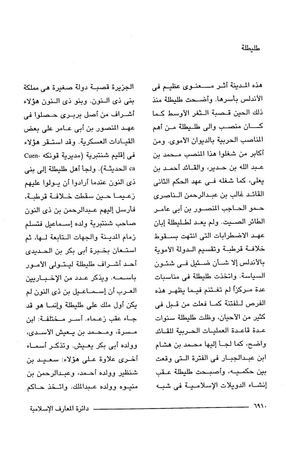 هذه المدينة أثر معنوى عظيم فى الأندلس بأسرها. وأضحت طليطلة منذ ذلك الحين قصبة الثغر الأوسط كما كان منصب والى طليطلة من أهم المناصب الحربية بالديوان الأموى. ومن أكابر من شغلوا هذا المنصب محمد بن عبد اللَّه بن حدير، والقائد أحمد بن يعلى، كما شغله فى عهد الحكم الثانى القائد غالب بن عبد الرحمن الناصرى حمو الحاجب المنصور بن أبى عامر الطائر الصيت. ولم يعد لطليطلة إبان عهد الاضطرابات التى انتهت بسقوط خلافة قرطبة وتقسيم الدولة الأموية بالأندلس إلا شأن ضئيل فى شئون السياسة. واتخذت طليطلة فى مناسبات عدة مركزًا لم تغتنم فيما يظهر هذه الفرص للفتنة كما فعلت من قبل فى كثير من الأحيان، وظلت طليطلة سنوات عدة قاعدة العمليات الحربية للقائد واضح، كما لجأ إليها محمد بن هشام ابن عبد الجبار فى الفترة التى وقعت بين حكميه، وأصبحت طليطلة عقب إنشاء الدويلات الإسلامية فى شبه الجزيرة قصبة دولة صغيرة هى مملكة بنى ذى النون. وبنو ذى النون هؤلاء أشراف من أصل بربرى حصلوا فى عهد المنصور بن أبى عامر على بعض القيادات العسكرية. وقد استقر هؤلاء فى إقليم شنتبرية (مديرية قونكه Cuenca الحديثة). ولجأ أهل طليطلة إلى بنى ذى النون عندما أرادوا أن يولوا عليهم زعيما حين سقطت خلافة قرطبة، فأرسل إليهم عبد الرحمن بن ذى النون صاحب شنتبرية ولده إسماعيل فتسلم زمام المدينة والجهات التابعة لها، ثم استعان بخبرة أبى بكر بن الحديدى أحد أشراف طليطلة ليتولى الأمور باسمه. ويذكر عدد من الإخباريين العرب أن إسماعيل بن ذى النون لم يكن أول ملك على طليطلة وإنما هو قد جاء عقب زعماء. أسر مختلفة: ابن مسرة، ومحمد بن يعيش الأسدى، وولده أبى بكر يعيش. وتذكر أسماء أخرى علاوة على هؤلاء: سعيد بن شنظير وولده أحمد، وعبد الرحمن بن منيوه وولده عبد الملك. واتخذ حاكم