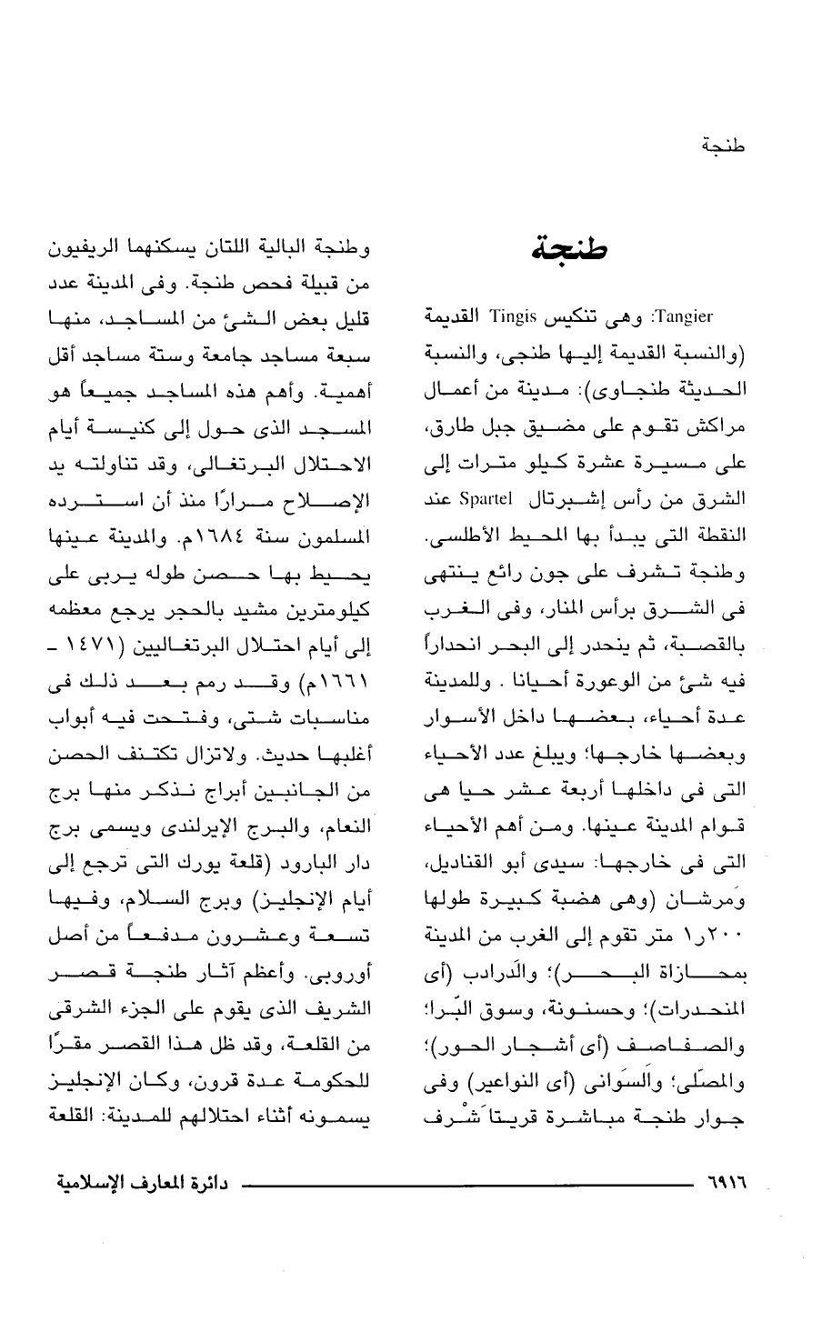 Tangier: وهى تنكيس Tingis القديمة (والنسبة القديمة إليها طنجى، والنسبة الحديثة طنجاوى): مدينة من أعمال مراكش تقوم على مضيق جبل طارق، على مسيرة عشرة كيلو مترات إلى الشرق من رأس إشبرتال Spartel عند النقطة التى يبدأ بها المحيط الأطلسى. وطنجة تشرف على جون رائع ينتهى فى الشرق برأس المنار، وفى الغرب بالقصبة، ثم ينحدر إلى البحر انحدارًا فيه شئ من الوعورة أحيانا. وللمدينة عدة أحياء، بعضها داخل الأسوار وبعضها خارجها؛ ويبلغ عدد الأحياء التى فى داخلها أربعة عشر حيا هى قوام المدينة عينها. ومن أهم الأحياء التى فى خارجها: سيدى أبو القناديل، وَمرشان (وهى هضبة كبيرة طولها 1.200 متر تقوم إلى الغرب من المدينة بمحازاة البحر)؛ والدرادب (أى المنحدرات)؛ وحسنونة، وسوق البّرا؛ والصفاصف (أى أشجار الحور)؛ والمصّلى؛ والسَوانى (أى النواعير) وفى جوار طنجة مباشرة قريتا شَرْف وطنجة البالية اللتان يسكنهما الريفيون من قبيلة فحص طنجة. وفى المدينة عدد قليل بعض الشئ من المساجد، منها سبعة مساجد جامعة وستة مساجد أقل أهمية. وأهم هذه المساجد جميعًا هو المسجد الذى حول إلى كنيسة أيام الاحتلال البرتغالى، وقد تناولته يد الإصلاح مرارًا منذ أن استرده المسلمون سنة 1684 م. والمدينة عينها يحيط بها حصن طوله يربى على كيلومترين مشيد بالحجر يرجع معظمه إلى أيام احتلال البرتغاليين (1471 - 1661 م) وقد رمم بعد ذلك فى مناسبات شتى، وفتحت فيه أبواب أغلبها حديث. ولا تزال تكتنف الحصن من الجانبين أبراج نذكر منها برج النعام، والبرج الإيرلندى ويسمى برج دار البارود (قلعة يورك التى ترجع إلى أيام الإنجليز) وبرج السلام، وفيها تسعة وعشرون مدفعًا من أصل أوروبى. وأعظم آثار طنجة قصر الشريف الذى يقوم على الجزء الشرقى من القلعة، وقد ظل هذا القصر مقرًا للحكومة عدة قرون، وكان الإنجليز يسمونه أثناء احتلالهم للمدينة: القلعة