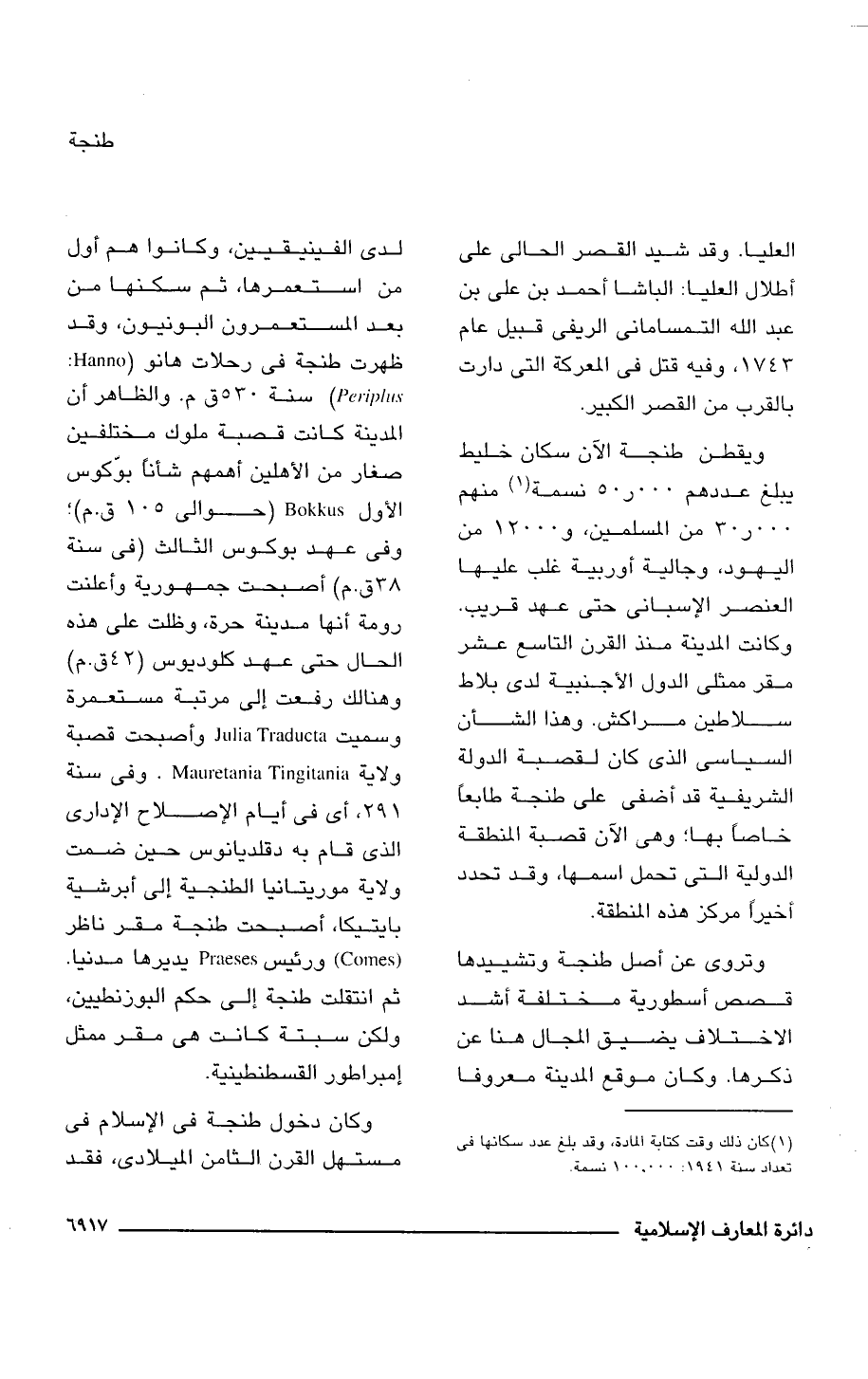 ويقطن طنجة الآن سكان خليط يبلغ عددهم 50.000 نسمة (¬1) منهم 30.000 من المسلمين، و 12000 من اليهود، وجالية أوربية غلب عليها العنصر الإسبانى حتى عهد قريب. وكانت المدينة منذ القرن التاسع عشر مقر ممثلى الدول الأجنبية لدى بلاط سلاطين مراكش. وهذا الشأن السياسى الذى كان لقصبة الدولة الشريفية قد أضفى على طنجة طابعًا خاصًا بها؛ وهى الآن قصبة المنطقة الدولية التى تحمل اسمها، وقد تحدد أخيرًا مركز هذه المنطقة.