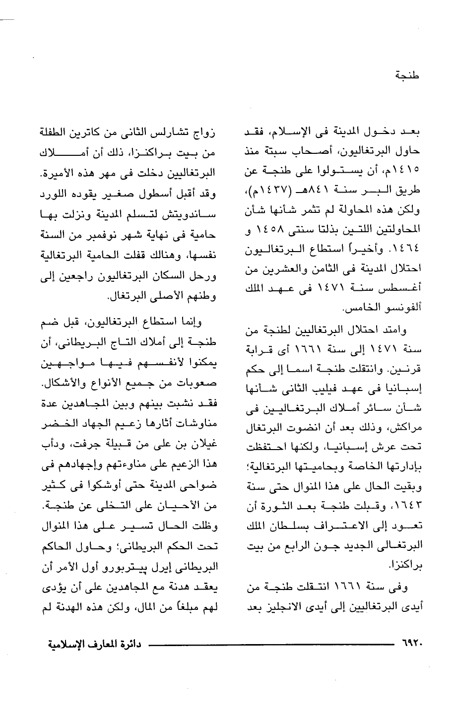 وفى سنة 1661 انتقلت طنجة من أيدى البرتغاليين إلى أيدى الانجليز بعد زواج تشارلس الثانى من كاترين الطفلة من بيت براكنزا، ذلك أن أملاك البرتغاليين دخلت فى مهر هذه الأميرة. وقد أقبل أسطول صغير يقوده اللورد ساندويتش لتسلم المدينة ونزلت بها حامية فى نهاية شهر نوفمبر من السنة نفسها، وهنالك قفلت الحامية البرتغالية ورحل السكان البرتغاليون راجعين إلى وطنهم الأصلى البرتغال.