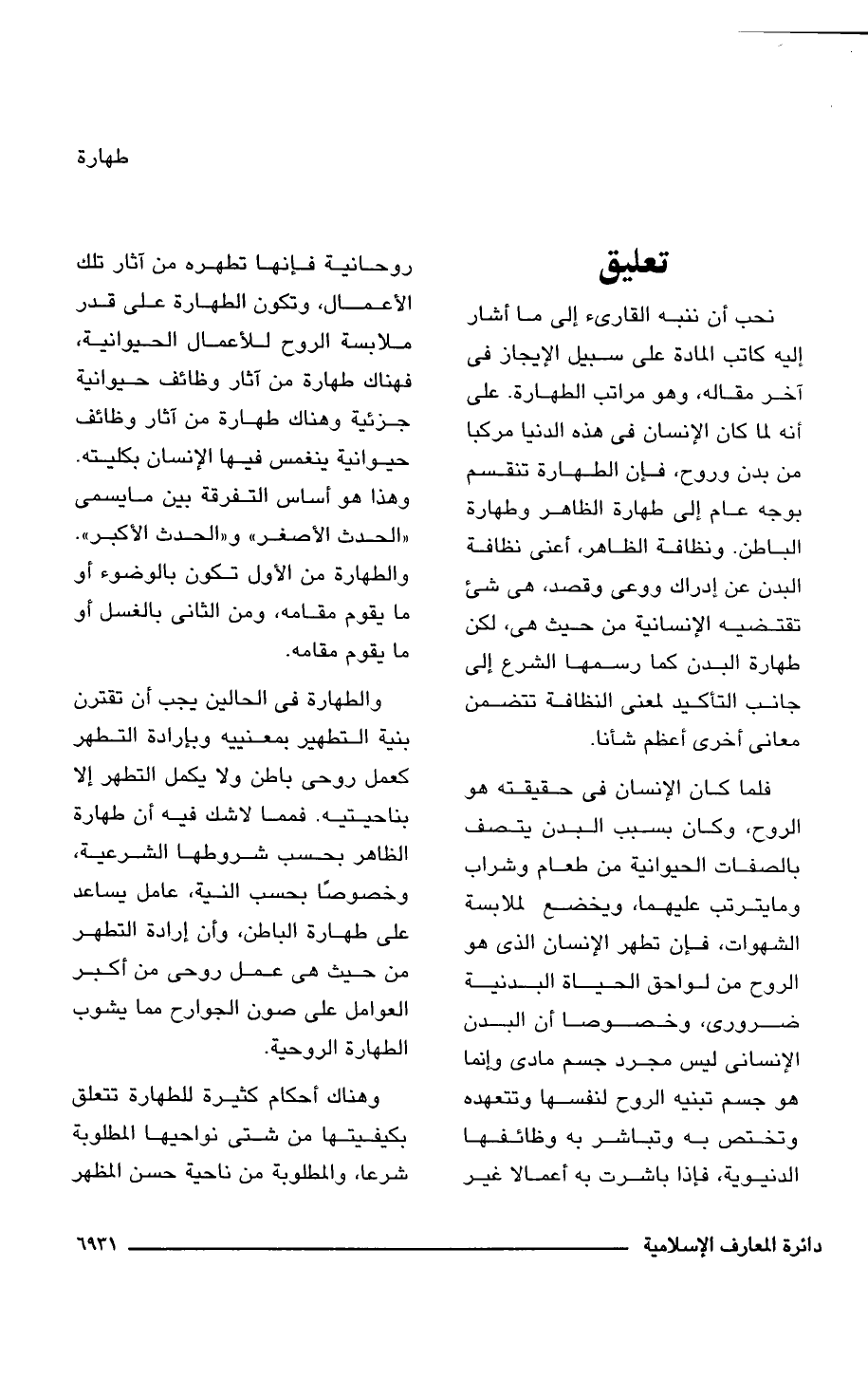 نحب أن ننبه القارئ إلى ما أشار إليه كاتب المادة على سبيل الإيجاز فى آخر مقاله، وهو مراتب الطهارة. على أنه لما كان الإنسان فى هذه الدنيا مركبا من بدن وروح، فإن الطهارة تنقسم بوجه عام إلى طهارة الظاهر وطهارة الباطن. ونظافة الظاهر، أعنى نظافة البدن عن إدراك ووعى وقصد، هى شئ تقتضيه الإنسانية من حيث هى، لكن طهارة البدن كما رسمها الشرع إلى جانب التأكيد لمعنى النظافة تتضمن معانى أخرى أعظم شأنًا.