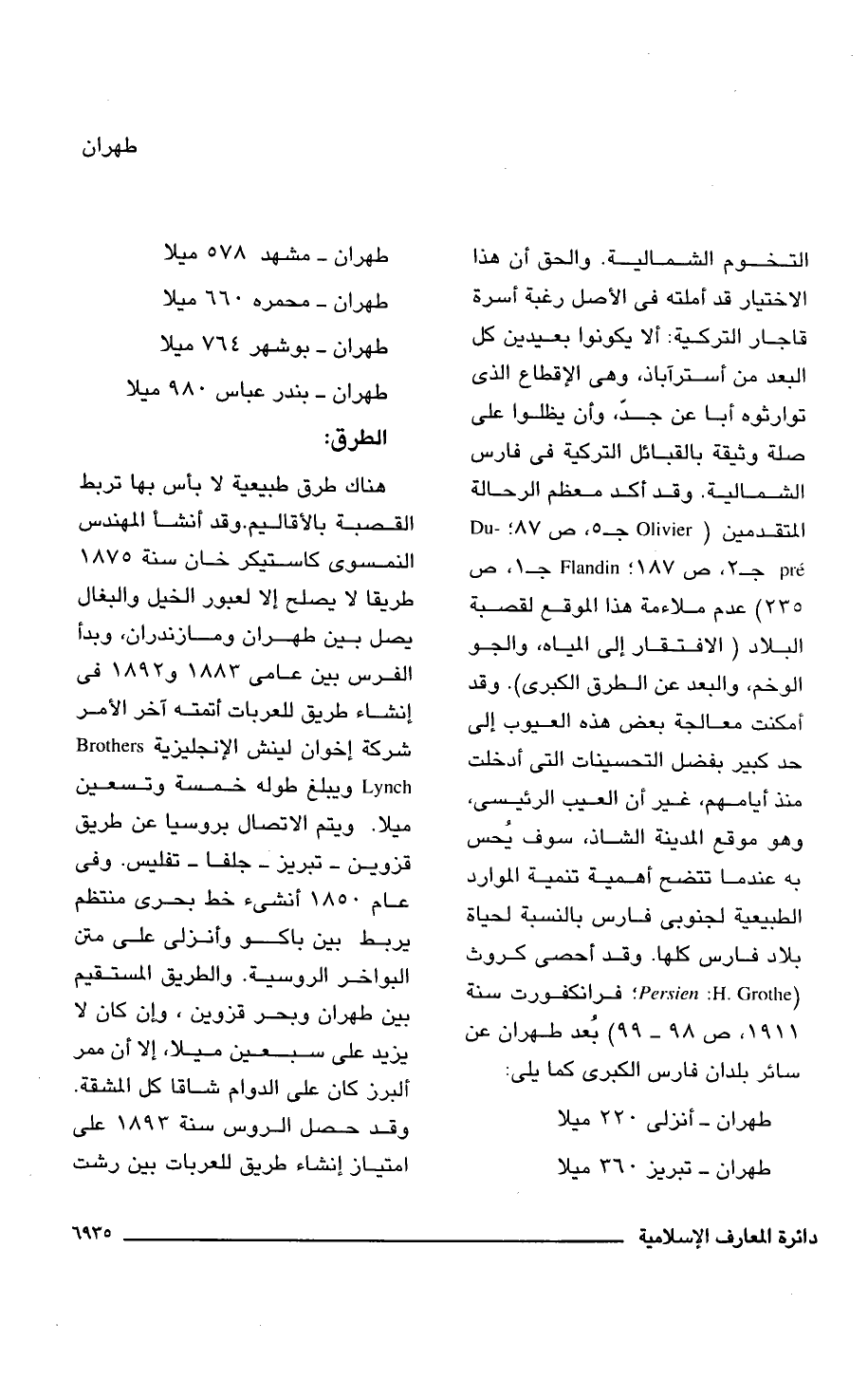 التخوم الشمالية. والحق أن هذا الاختيار قد أملته فى الأصل رغبة أسرة قاجار التركية: ألا يكونوا بعيدين كل البعد من أسترآباذ، وهى الإقطاع الذى توارثوه أبا عن جدّ، وأن يظلوا على صلة وثيقة بالقبائل التركية فى فارس الشمالية. وقد أكد معظم الرحالة المتقدمين (Olivier جـ 5، ص 87؛ Dupre جـ 2، ص 187؛ Flandin جـ 1، ص 235) عدم ملاءمة هذا الموقع لقصبة البلاد (الافتقار إلى المياه، والجو الوخم، والبعد عن الطرق الكبرى). وقد أمكنت معالجة بعض هذه العيوب إلى حد كبير بفضل التحسينات التى أدخلت منذ أيامهم، غير أن العيب الرئيسى، وهو موقع المدينة الشاذ، سوف يُحس به عندما تتضح أهمية تنمية الموارد الطبيعية لجنوبى فارس بالنسبة لحياة بلاد فارس كلها. وقد أحصى كروث (Persien: H. Grothe؛ فرانكفورت سنة 1911، ص 98 - 99) بُعد طهران عن سائر بلدان فارس الكبرى كما يلى: