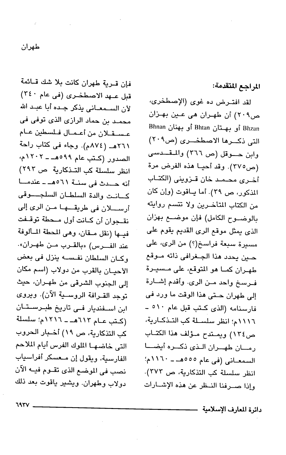 لقد افترض ده غوى (الإصطخرى، ص 209) أن طهران هى عين بهزان Bhzan أو بهتان Bhtan أو بهنان Bhnan التى ذكرها الاصطخرى (ص 209) وابن حوقل (ص 366) والمقدسى (ص 375). وقد أحيا هذه الفرض مرة أخرى محمد خان قزوينى (الكتاب المذكور، ص 39). أما ياقوت (وإن كان من الكتاب المتأخرين ولا تتسم روايته بالوضوح الكامل) فإن موضع بهزان الذى يمثل موقع الرى القديم يقوم على مسيرة سبعة فراسخ (؟ ) من الرى، على حين يحدد هذا الجغرافى ذاته موقع طهران كما هو المتوقع، على مسيرة فرسخ واحد من الرى. وأقدم إشارة إلى طهران حتى هذا الوقت ما ورد فى فارسنامه (الذى كتب قبل عام 510 - 1116 م؛ انظر سلسلة كب التذكارية، ص 134) ويمتدح مؤلف هذا الكتاب رمان طهران الذى ذكره أيضا السمعانى (فى عام 555 هـ - 1160 م)؛ انظر سلسلة كب التذكارية، ص 373). وإذا صرفنا النظر عن هذه الإشارات فإن قرية طهران كانت بلا شك قائمة قبل عهد الاصطخرى (فى عام 340) لأن السمعانى يذكر جده أبا عبد اللَّه محمد بن حماد الرازى الذى توفى فى عسقلان من أعمال فلسطين عام 261 هـ (874 م). وجاء فى كتاب راحة الصدور (كتب عام 599 هـ - 1202 م, انظر سلسلة كب التذكارية ص 293) أنه حدث فى سنة 561 هـ - عندما كانت والدة السلطان السلجوقى أرسلان فى طريقها من الرى إلى نقجوان أن كانت أول محطة توقفت فيها (نقل مقان، وهى المحطة المألوفة عند الفرس) "بالقرب من طهران". وكان السلطان نفسه ينزل فى بعض الأحيان بالقرب من دولاب (اسم مكان إلى الجنوب الشرقى من طهران، حيث توجد القرافة الروسية الآن). ويروى ابن اسفنديار فى تاريخ طبرستان (كتب عام 613 هـ - 1216 م؛ سلسلة كب التذكارية، ص 19) أخبار الحروب التى خاضها الملوك الفرس أيام الملاحم الفارسية، ويقول إن معسكر أفراسياب نصب فى الموضع الذى تقوم فيه الآن دولاب وطهران. ويشير ياقوت بعد ذلك