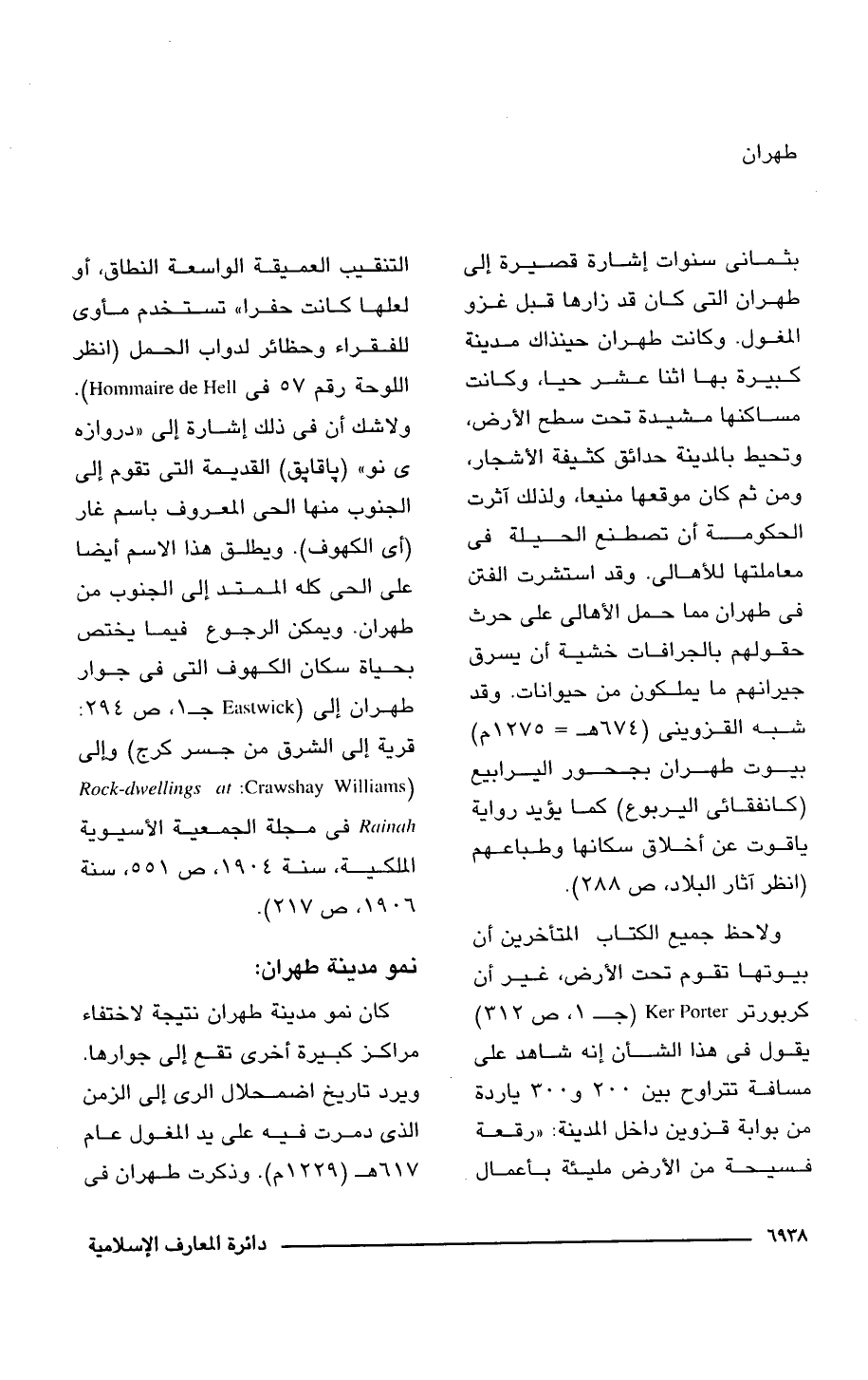 بثمانى سنوات إشارة قصيرة إلى طهران التى كان قد زارها قبل غزو المغول. وكانت طهران حينذاك مدينة كبيرة بها اثنا عشر حيا، وكانت مساكنها مشيدة تحت سطح الأرض، وتحيط بالمدينة حدائق كثيفة الأشجار، ومن ثم كان موقعها منيعا، ولذلك آثرت الحكومة أن تصطنع الحيلة فى معاملتها للأهالى. وقد استشرت الفتن فى طهران مما حمل الأهالى على حرث حقولهم بالجرافات خشية أن يسرق جيرانهم ما يملكون من حيوانات. وقد شبه القزوينى (674 هـ = 1275 م) بيوت طهران بجحور اليرابيع (كانفقائى اليربوع) كما يؤيد رواية ياقوت عن أخلاق سكانها وطباعهم (انظر آثار البلاد، ص 288).