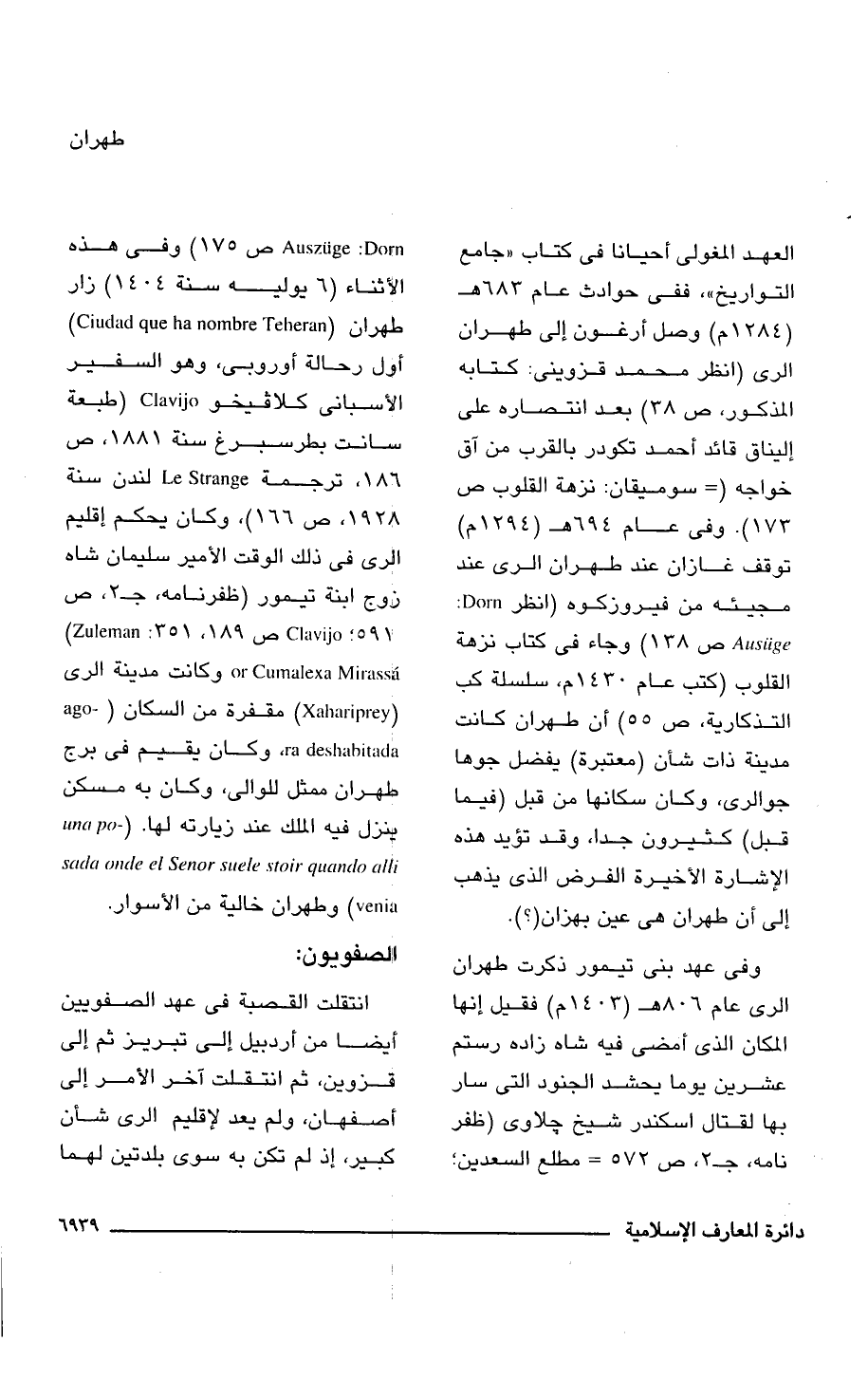 العهد المغولى أحيانا فى كتاب "جامع التواريخ"، ففى حوادث عام 683 هـ (1284 م) وصل أرغون إلى طهران الرى (انظر محمد قزوينى: كتابه المذكور، ص 38) بعد انتصاره على إليناق قائد أحمد تكودر بالقرب من آق خواجه (= سوميقان: نزهة القلوب ص 173). وفى عام 694 هـ (1294 م) توقف غازان عند طهران الرى عند مجيئه من فيروزكوه (انظر Dorn: Ausiige ص 138) وجاء فى كتاب نزهة القلوب (كتب عام 1430 م، سلسلة كب التذكارية، ص 55) أن طهران كانت مدينة ذات شأن (معتبرة) يفضل جوها جوالرى، وكان سكانها من قبل (فيما قبل) كثيرون جدا، وقد تؤيد هذه الإشارة الأخيرة الفرض الذى يذهب إلى أن طهران هى عين بهزان (؟ ).